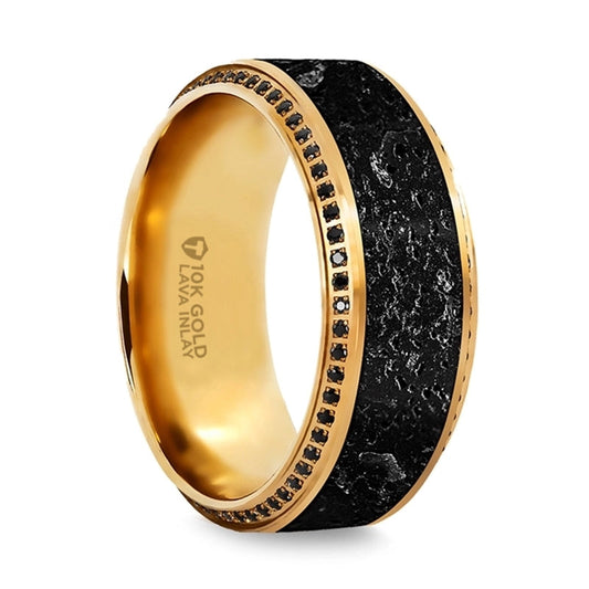 10k Yellow Gold Men's Wedding Band with Lava Rock Inlay & Black Diamonds