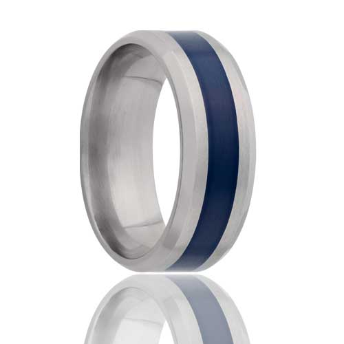Dark Blue Stripe Inlay Titanium Wedding Band with Beveled Edges