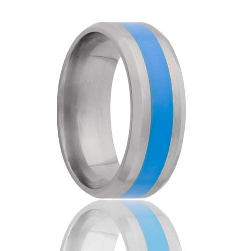 Light Blue Stripe Inlay Titanium Wedding Band with Beveled Edges