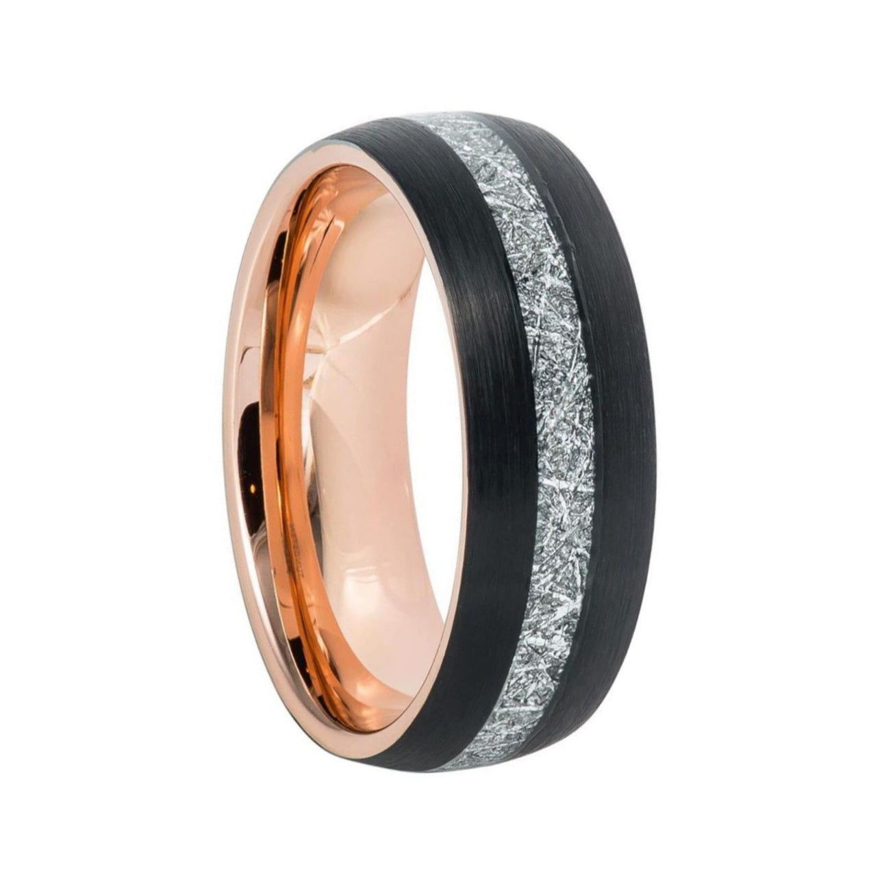 Looking for a wedding band that looks out of this world but are affordable? Check out our Black Tungsten Men's Wedding Band with Imitation Meteorite Inlay and Rose Gold Interior! This sleek and stylish ring is perfect for the modern groom who wants to make a statement on his big day. Crafted from high-quality tungsten, this ring is designed to last. The imitation meteorite inlay adds a touch of cosmic flair, while the rose gold interior adds a touch of class. And with its comfortable fit, you won't have to worry about taking it off. But this ring isn't just for weddings. It's perfect for any occasion where you want to look your best. Whether you're dressing up for a night out or going to a job interview, this ring will make you feel confident and stylish. So why settle for a boring ring when you can have one that's truly out of this world? Order your Black Tungsten Men's Wedding Band with Imitation Meteorite Inlay and Rose Gold Interior today and start turning heads.
