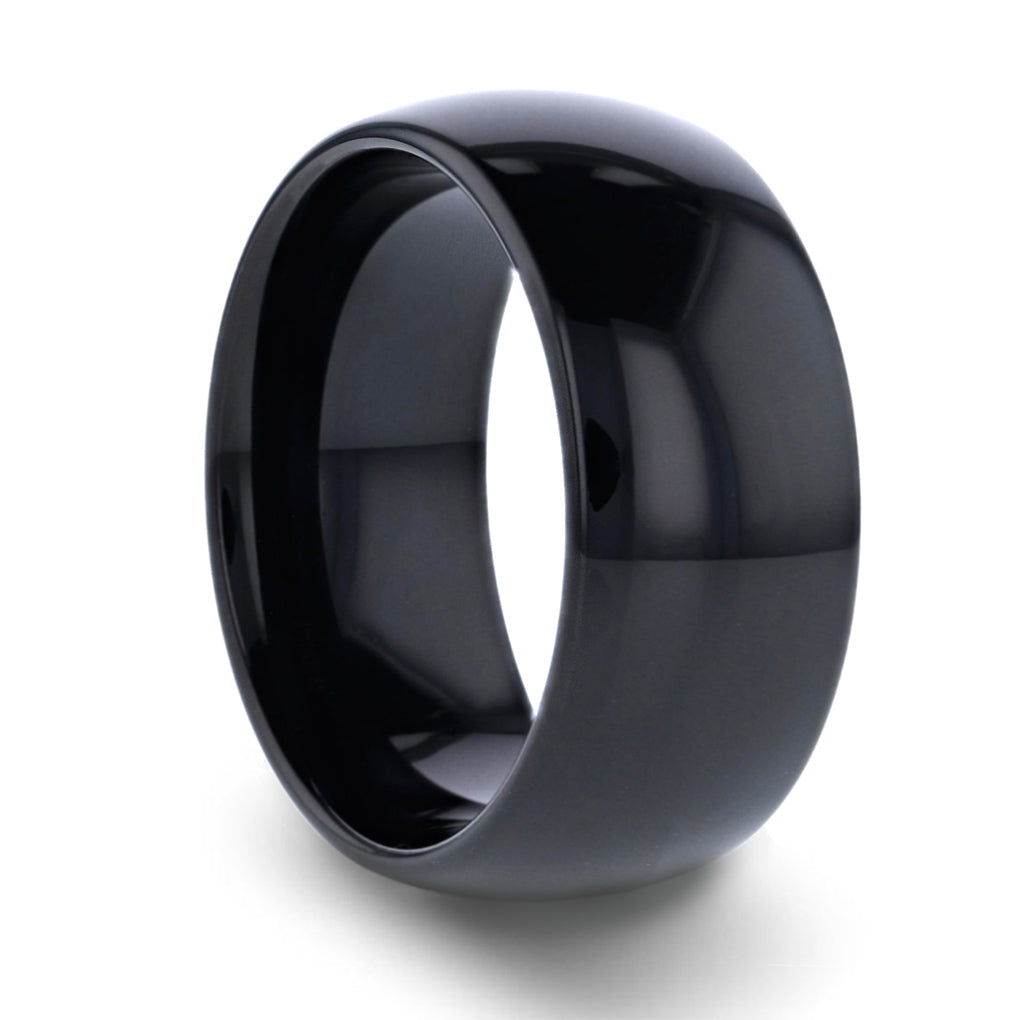 Elegant in its color and classic in its style, this band is made in the traditional domed design with a finely polished like finish in a very wide style for those extra wide ring lovers. Made from tungsten carbide metal, it is one of the strongest metals to be used in jewelry, making it ideal for men and women who are tired of rings that scratch and damage easily. This round polished black ring is quickly becoming the new classic. With an affordable price and scratch resistance, black tungsten carbide is quickly becoming one of the most popular metals on the jewelry market.