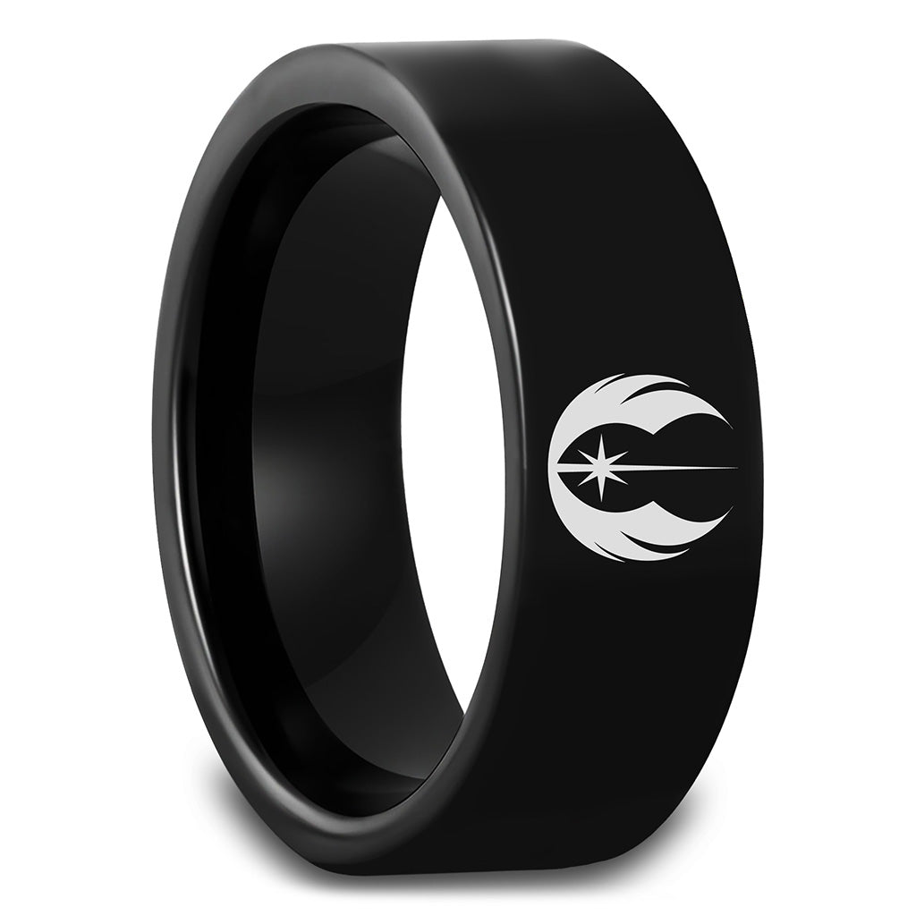 Crafted from hard-wearing tungsten carbide, this black ring with the Jedi Order symbol engraved on it is the perfect wedding band for a Star Wars fan. This black ring with a sleek polished finish possesses a timeless design and compliments any attire. Its austere yet sophisticated look aptly represents your commitment and love. It's a welcomed change from the traditional wedding rings. Durable and lightweight, Tungsten carbide is a must-have metal for the contemporary gentleman. This stunner is a truly exclusive, unique ring that caters to a groom who's after a one-of-a-kind ring. It balances a modern and eccentric appeal that will definitely turn heads wherever you go. Its comfort fit interior ensures maximum comfort all day long. Tungsten Carbide, a sturdy metal, will not only withstand the elements of Hoth, but it will also justly supplement any lightsaber fight. Even on your fortieth wedding anniversary, this wedding band will faithfully be by your side, ever so bright and brilliant.