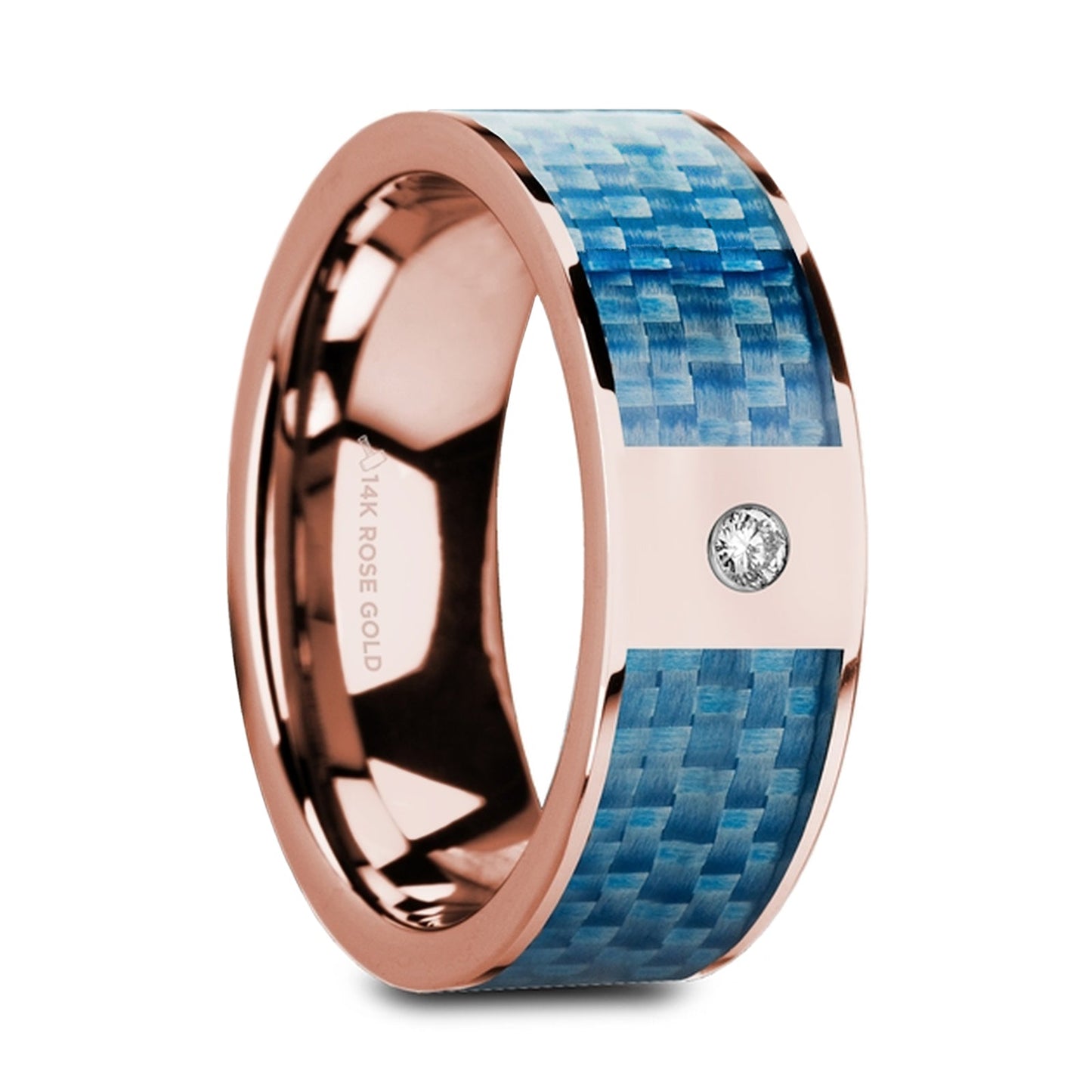 14k Rose Gold Men's Wedding Band with Blue Carbon Fiber Inlay & Diamond
