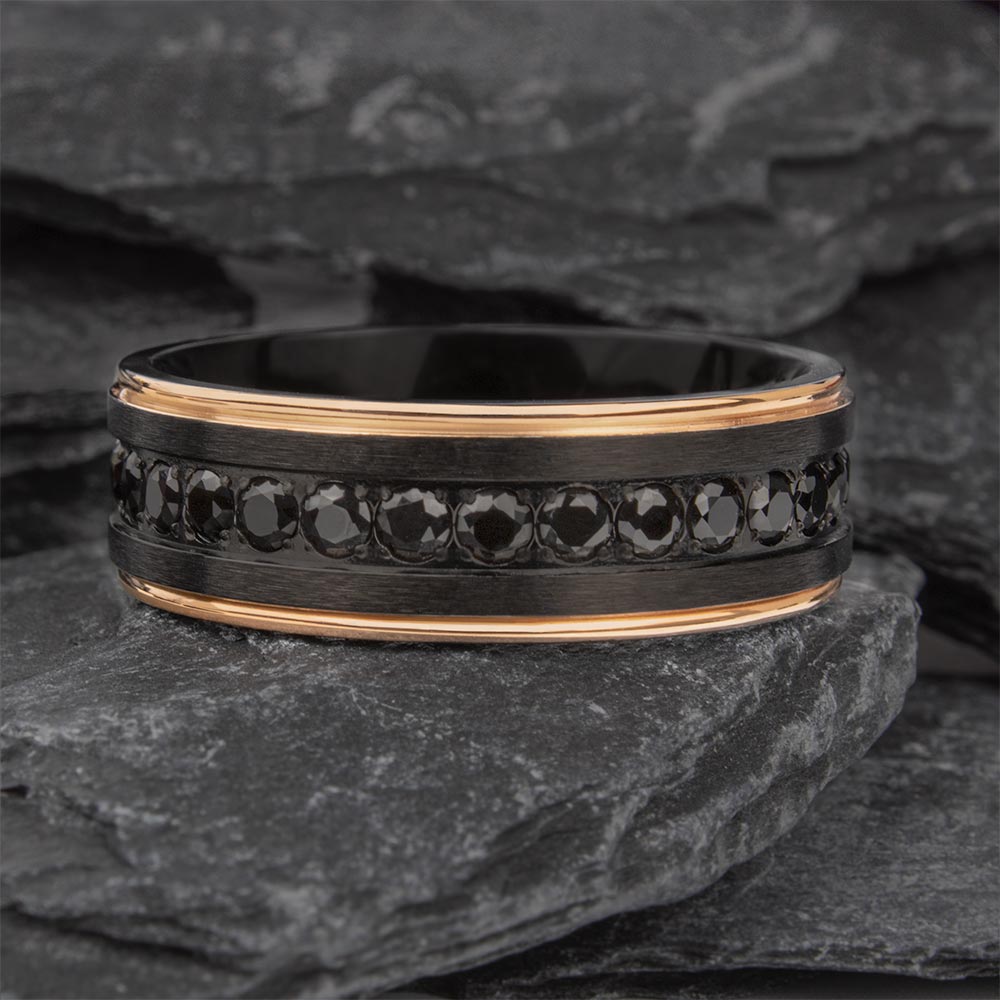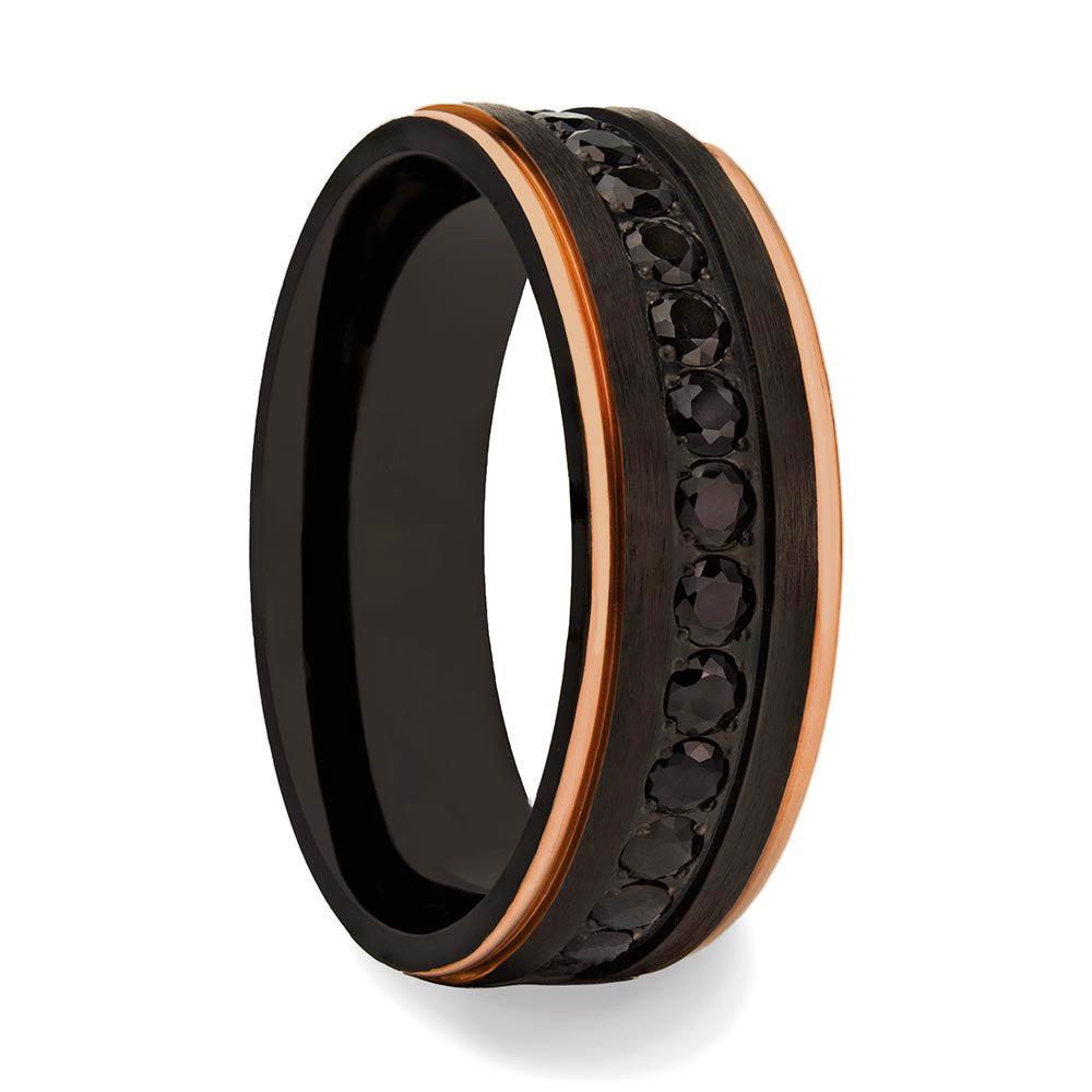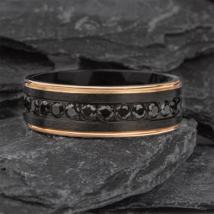 Black Titanium Men's Wedding Band with Rose Gold Edges & Black Gemstones