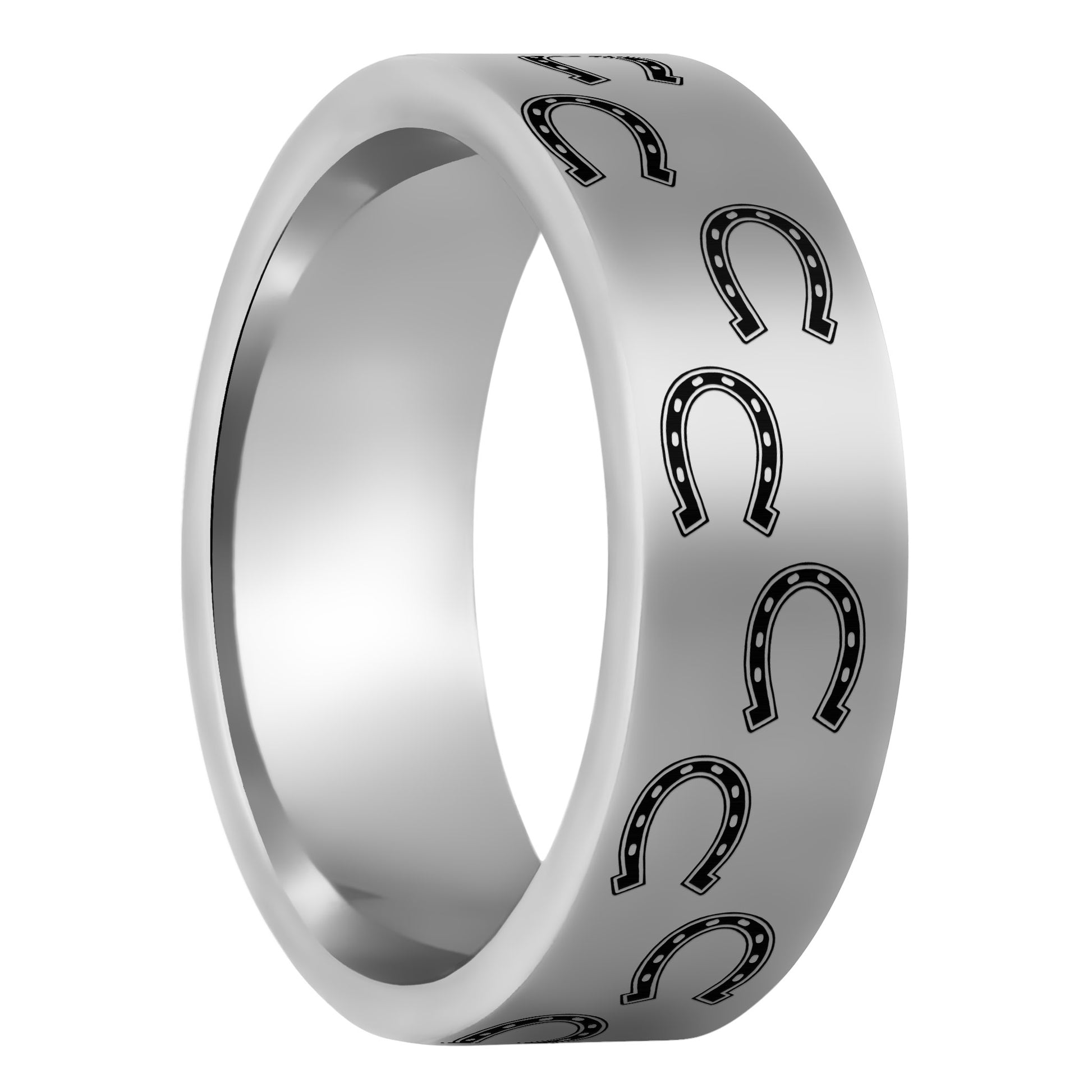 Your heart probably pounds like a herd of horses hooves whenever you see your partner, and this horseshoe engraved ring serves as a continual reminder of how important that feeling is to you. The ring had slightly curved edges for a smooth feel as you are wearing it. Cool and smooth, the silver tungsten band fits comfortable and lasts like no other metal. The circle of horseshoes impression of fortune following you throughout your whole life. What more could you ask for in a wedding ring with a clean style and an iconic imagery of a noble heart?