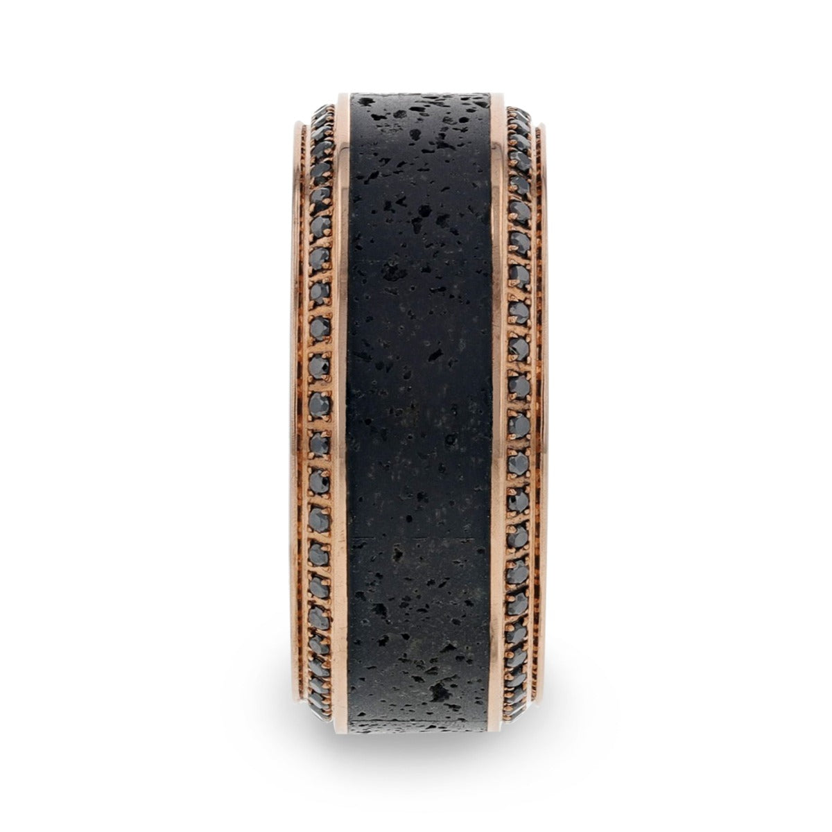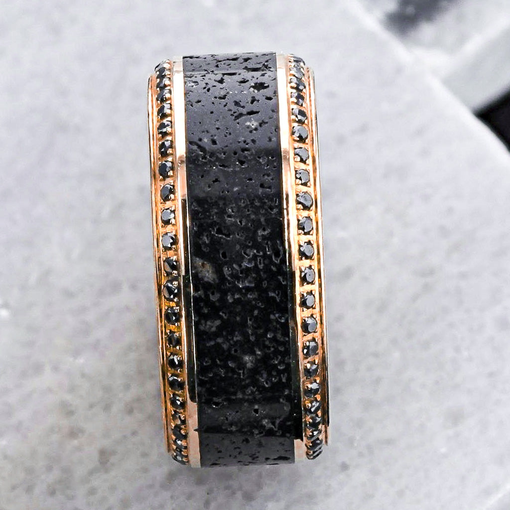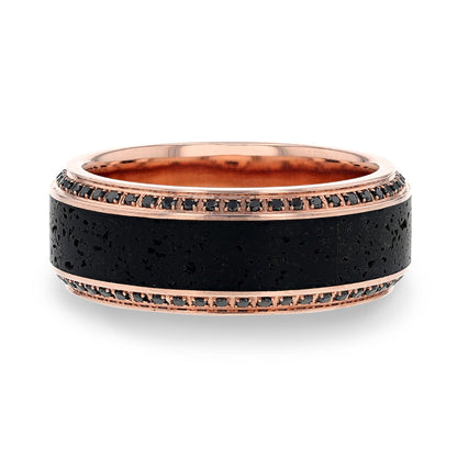 10k Rose Gold Men's Wedding Band with Lava Rock Inlay & Black Diamonds