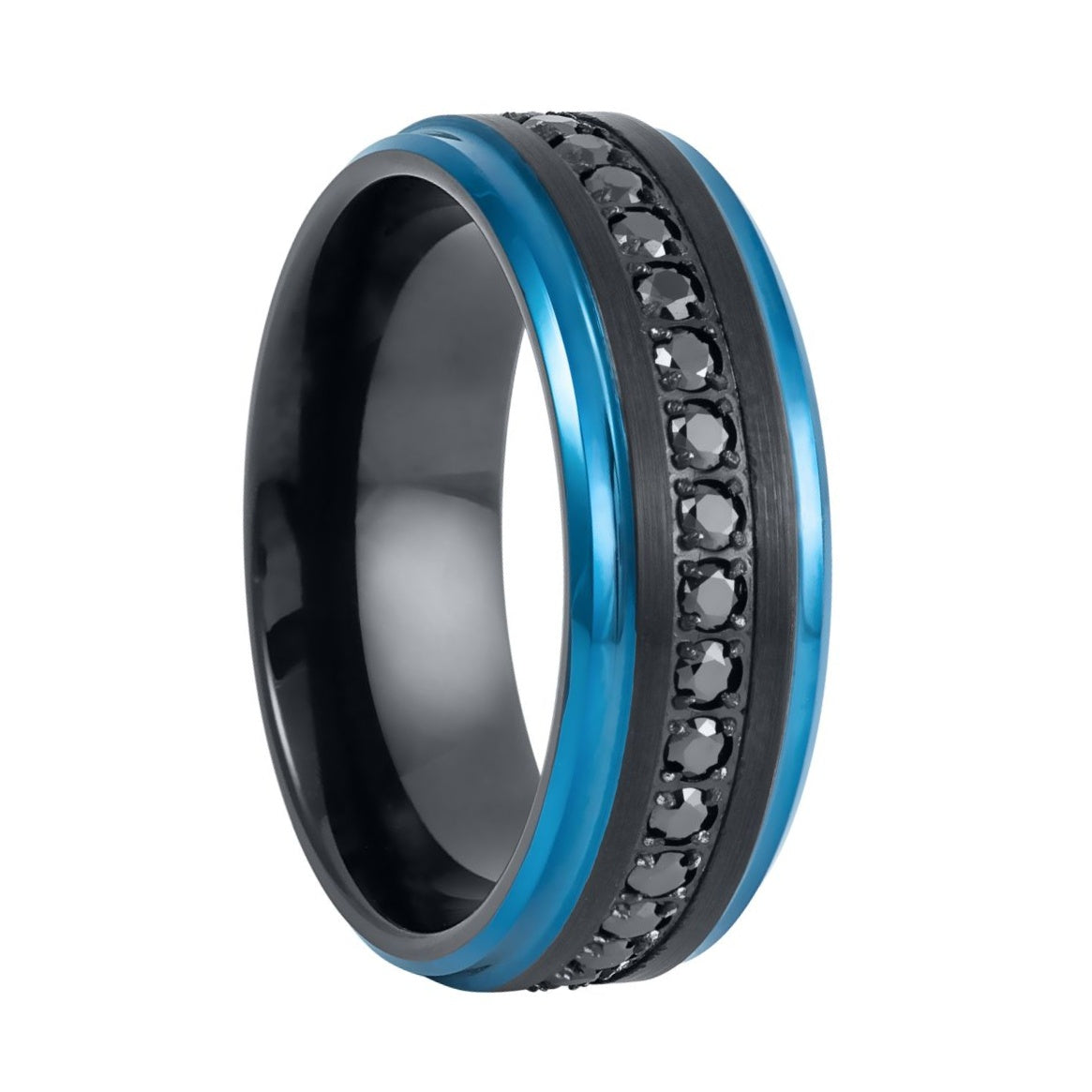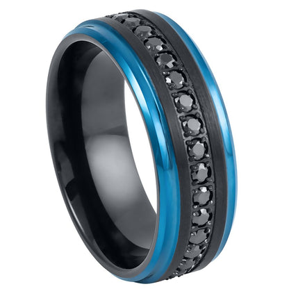 Black Tungsten Men's Wedding Band with Black Cubic Zirconia & Blue Edges