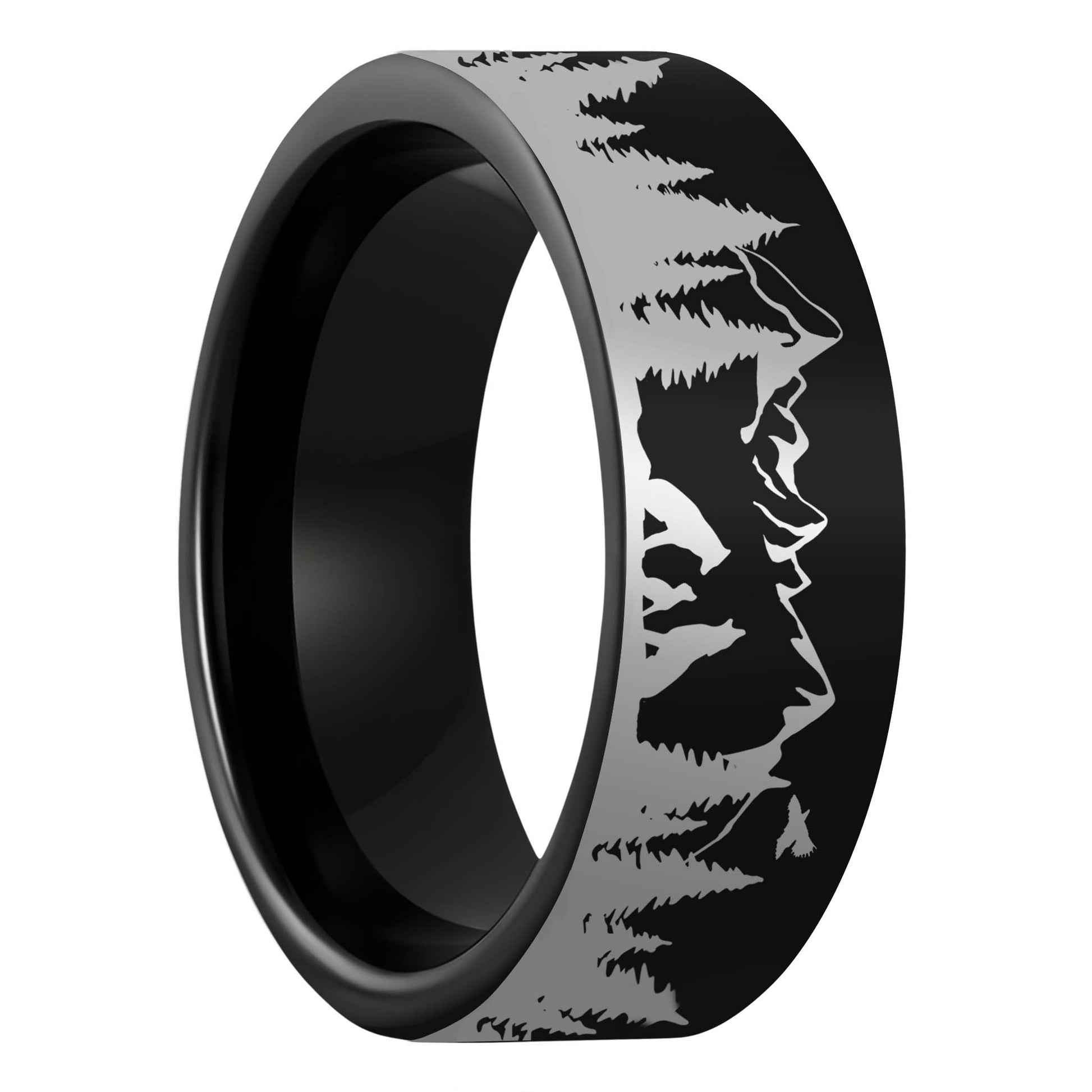 Surprise your lone wolf with this stunning black tungsten ring. This ring depicts a lone wolf in its natural habitat. The black tungsten carbide represents the night sky, while the engraving shows an idyllic scene. This ring would be perfect for the one in your life who strives to strike out on their own, but also needs the support of those around them. Show your support even more by adding a touch of personalization with the engraving service option. Perfect for those who want to showcase their love for nature and wildlife, this band features a breathtaking landscape engraving of a majestic wolf. Made of high-quality tungsten, this band is both durable and scratch-resistant, ensuring that it will last a lifetime. Not only does this band look amazing, it also comes with a lifetime warranty. That means if you ever need to exchange it for a different size or if it gets damaged, you're covered. No need to worry about settling for a lesser quality ring when you can have a beautiful and long-lasting one like this. Whether you're looking for a wedding band for yourself or a gift for someone special, the wolf landscape scene engraved black tungsten wedding band is sure to be a hit.