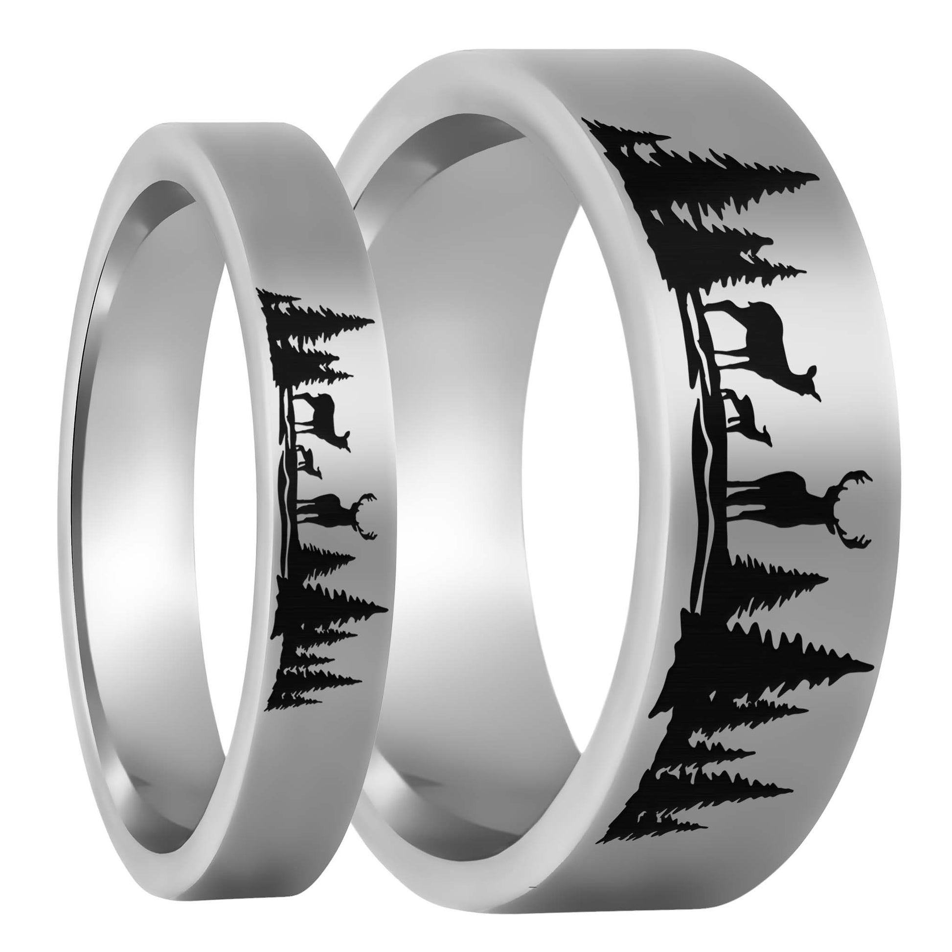 Deer & Landscape Scene Tungsten Couple's Matching Wedding Band Set