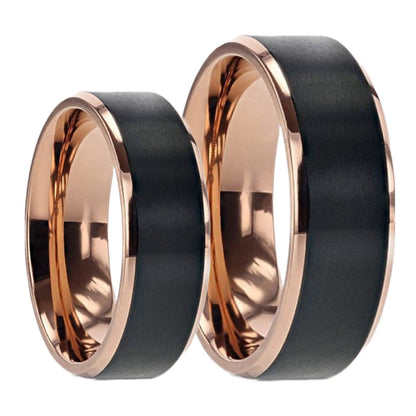 Weddings are a special time full of excitement; get this titanium couple's wedding band and seal your heartfelt love and commitment to your significant other in style. This band is for a couple who won’t fold in marriage despite the ups and downs of life. The addition of a rose-gold plating adds a rich contract that is as sophisticated as it is eye-catching. This rose gold band is not only a reminder of your vows, but also a symbol of an everlasting covenant with the love of your life. Thanks to the band set comfort fit, the ring will easily glide on and off your finger. This titanium couple's wedding ring is high grade and highly scratch resistant compared to softer metals like silver and gold. Made with precision, the ring has a brushed finish that will get you falling in love daily. For a man looking for a ring that needs no explanation, this is it. Stand out from the crowd with this fetching black titanium and rose gold couple's wedding band set.