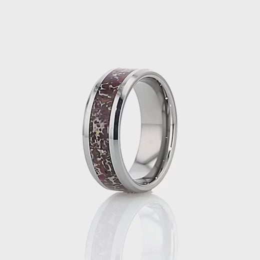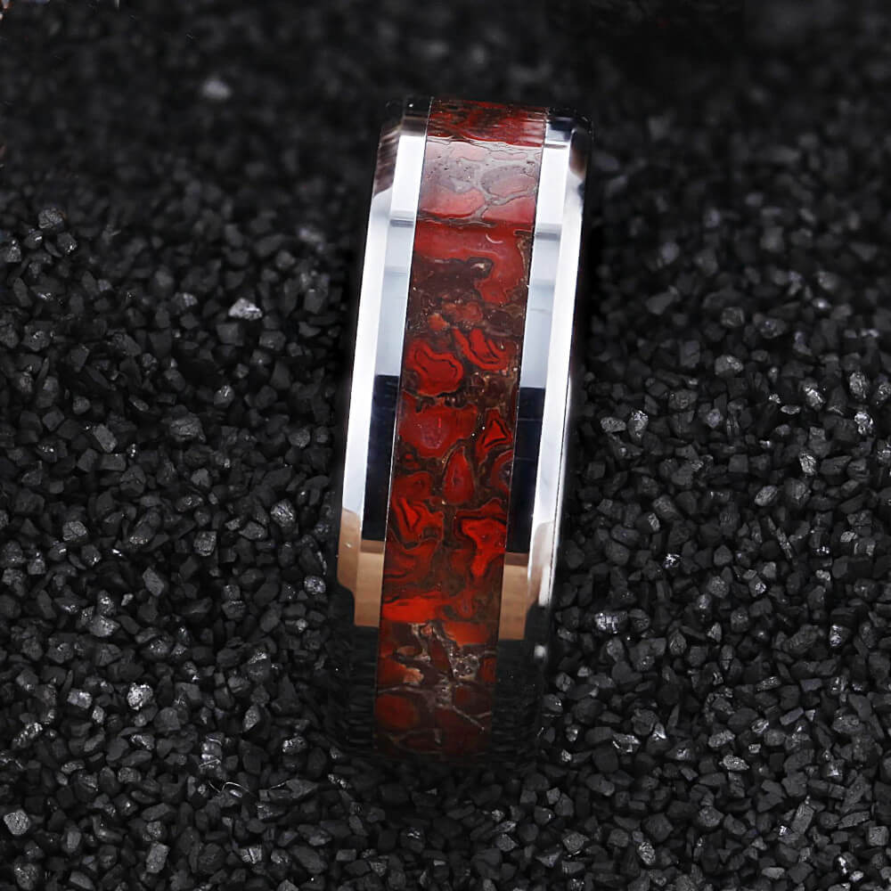 Tungsten Men's Wedding Band with Red Dinosaur Bone Inlay