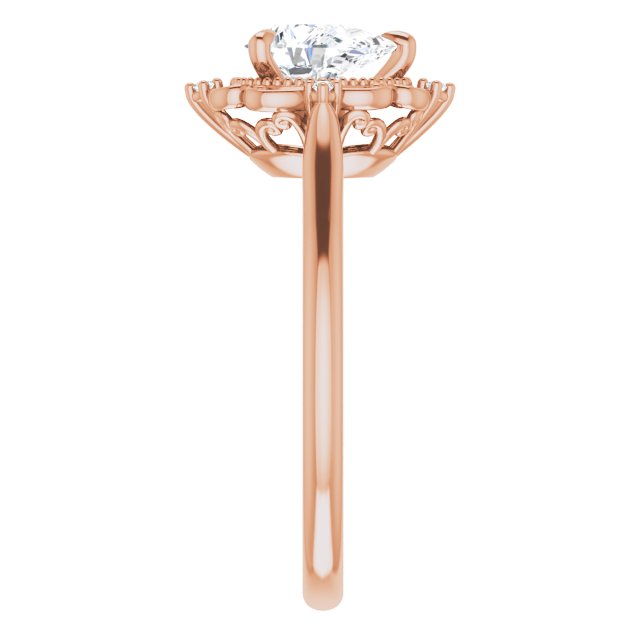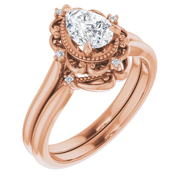 This gorgeous vintage-inspired women's rose gold wedding band is set with faceted pear and round lab-created moissanites. Strike a perfect balance between beautiful, eco-friendly, and affordable with lab-grown moissanite, which imitates the sparkle of diamonds at a fraction of the price. Add an optional matching wedding band to complete the set.