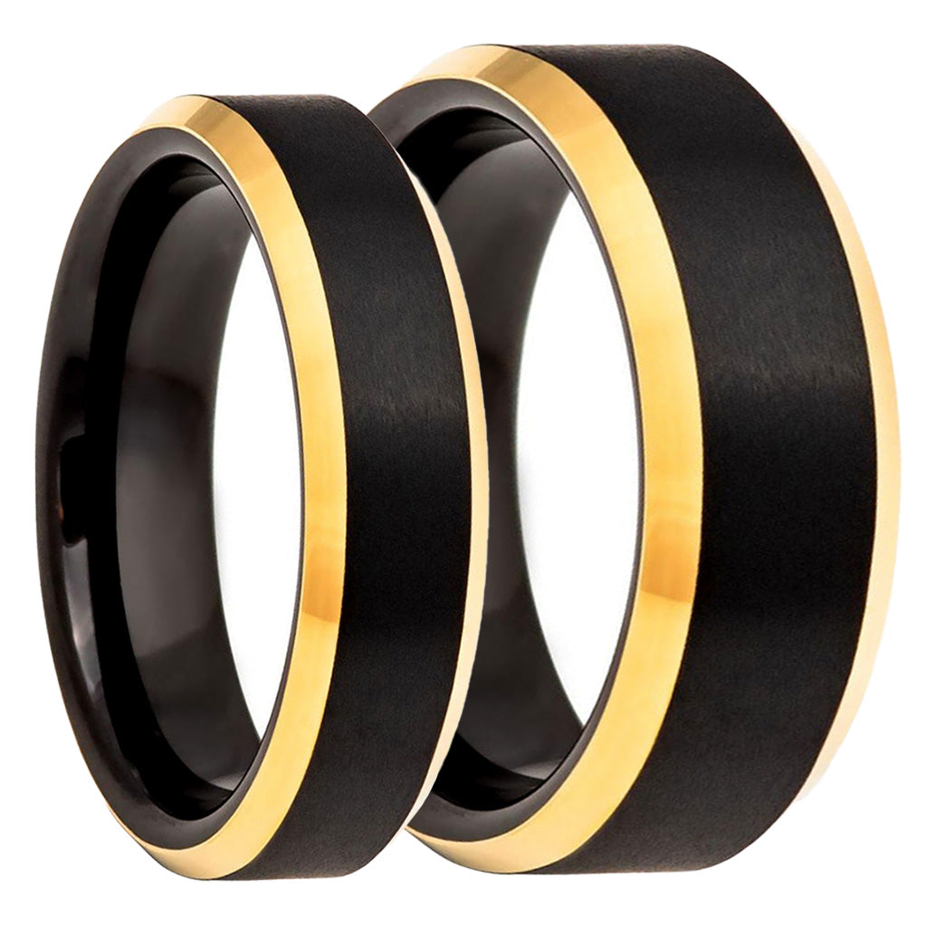 Black Tungsten Couple's Matching Wedding Band Set with Beveled Gold Edges