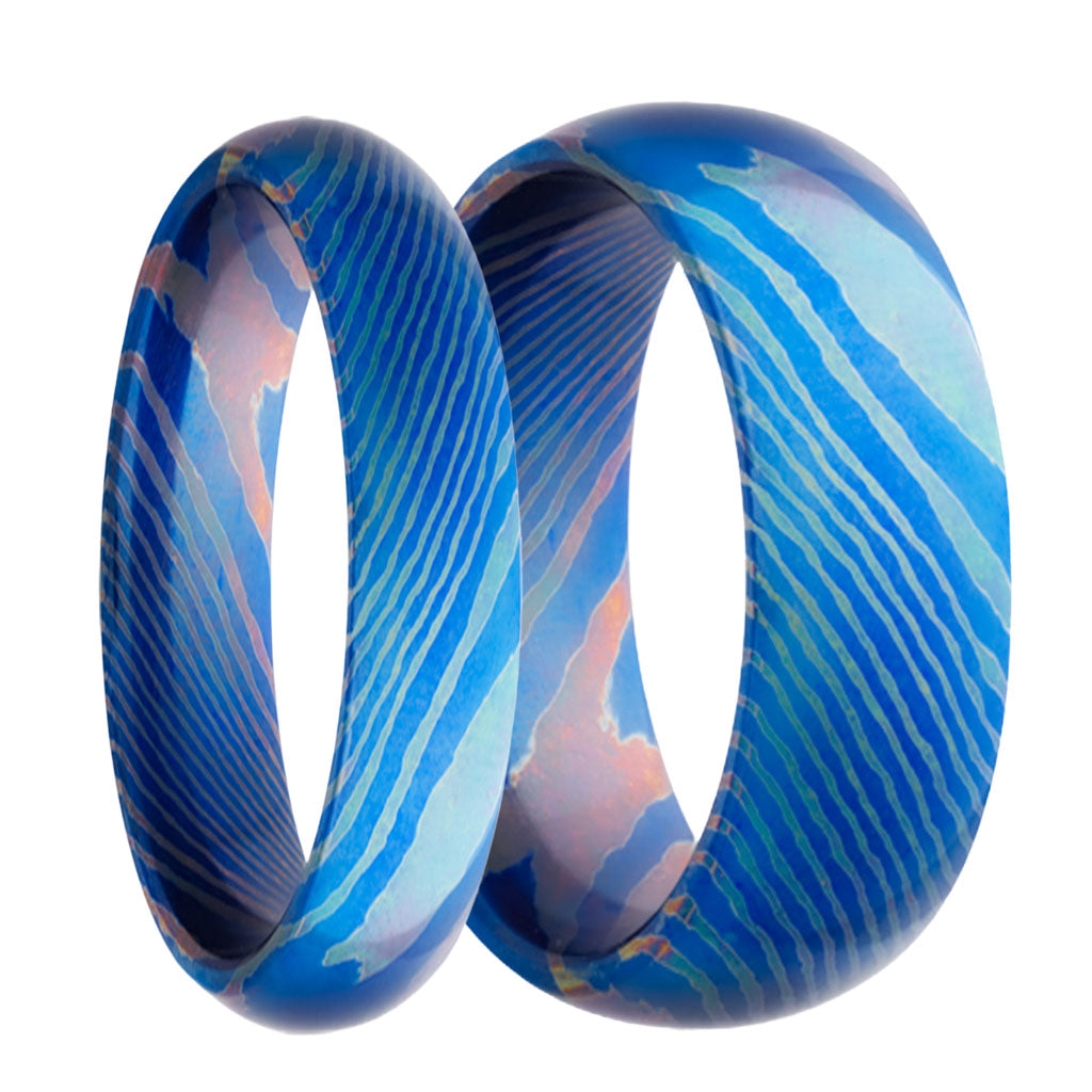 Blue Mokume Gane Style Titanium Couple's Matching Wedding Band Set