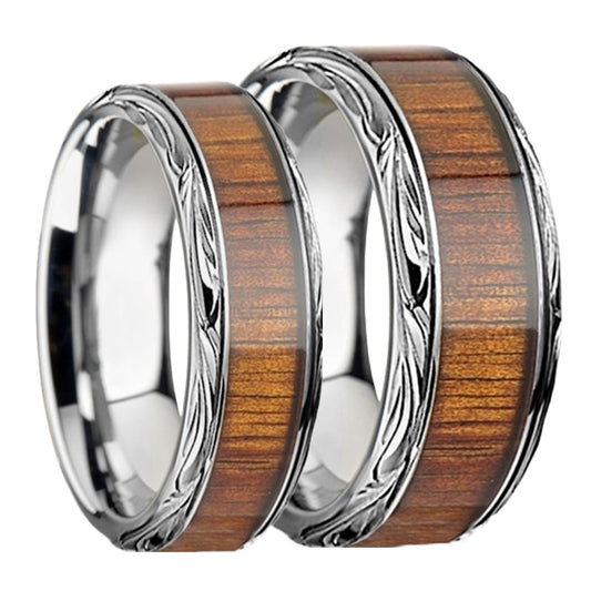 Intricate Edge Titanium Couple's Matching Wedding Band Set with Koa Wood Inlay