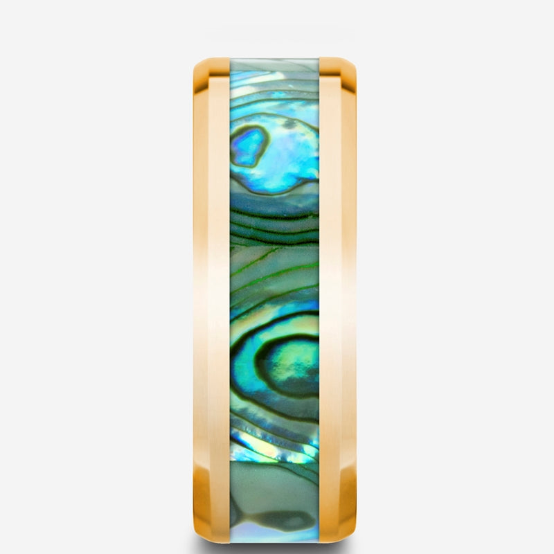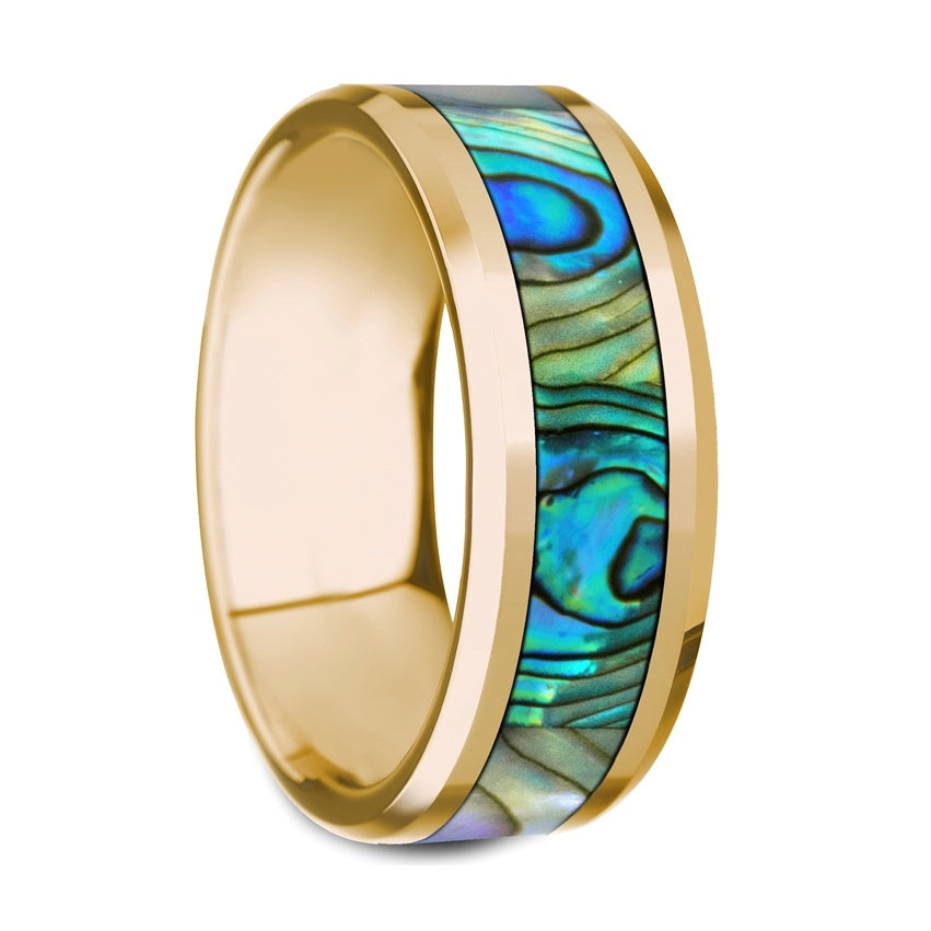 Dreamlike! This yellow gold wedding ring will remind him of the Aurora Borealis with its shades of teal, blue, and ocean-like green that seem to float across the surface of this truly stunning ring. Inlaid with mother of pearl, this piece of art is truly a one-of-a-kind ring. Combined with 14 Karat Yellow Gold, this surreal ring will surely dazzle your significant other into speechlessness. This men's wedding band offers a stunning range of colors that speak to the romantic in each of us with its hypnotizing hues and near iridescent tones. Lightweight and made from classic yellow gold, this ring is a modern take on a traditional favorite. In search of a wedding ring that fits your style? Then look no further. This is one ring that you will forever hold dear. Turn heads wherever you go with this alluring band. This wedding ring showcases an entire circle of mother-of-pearl inlay set in beveled polished yellow gold. The pristine sparkle of this elegant style makes it the perfect wedding band. The color on the ring's center is like a special secret or a little wink to the wearer. Gold is a sign of luxury and bold expression. The brilliance of gold further represents love and passion. What better way to match your feelings than by adorning this piece on your wedding day. The flawless details only enhance the beauty of the ring without overpowering it. Such a noticeable addition, you'll be the center of attraction every time you step out. There is no question that this impressive ring is worth showing off.