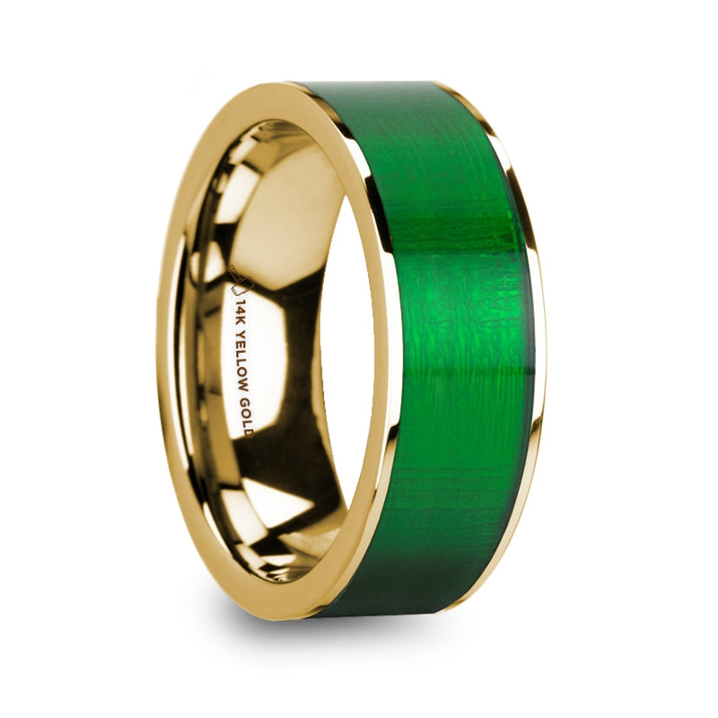 A burst of vivid green color married to the classic 14k yellow gold creates a sharp statement in a wedding ring. Not one to hide, this ring promotes an outgoing and dazzling personality. The smooth, flat edges of the band are comfortable to wear and polished so the gold band agrees with the green inlay like a match made in heaven. In fact, the green is reminiscent of the legendary and rare green flash of the setting sun out on the ocean's horizon. And together, like your perfect love, the two cultivated materials are an illustrious and unstoppable combination