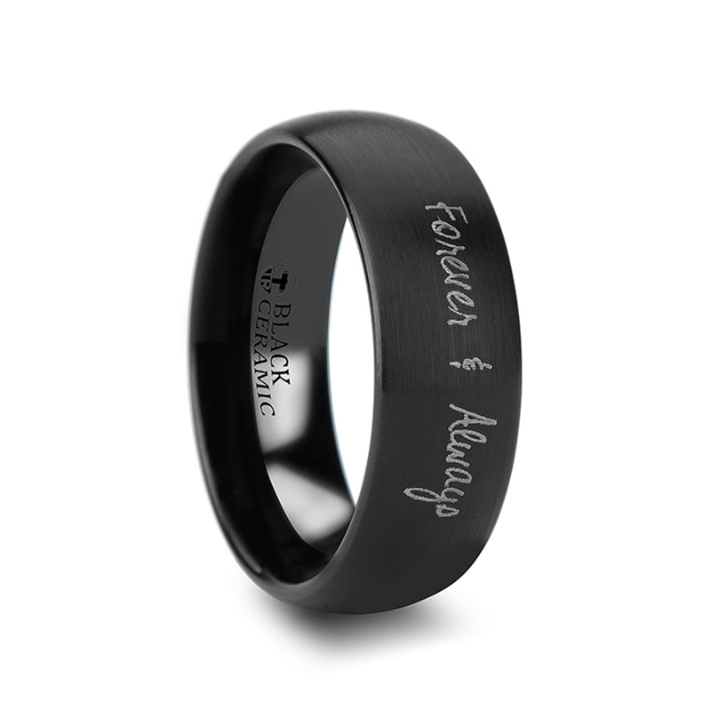 The brushed surface of this engaging wedding band holds an infinity of promise. One that should never be taken lightly. And in your case we are quite sure you went into this knowing exactly what you were looking for. Even if you didn ' know it until the moment your eyes saw nothing beside her. The word became a frequent flier in your heart and now it plays beautifully through your mind. She has been your forever since the beginning of time and now you both are finally in each other's arms as well. What a wonderful forever it's turned out to be, may your bond only grow stronger with time, let this beautiful black ceramic band remind you of the strength that bond began with and build your excitement because forever is a long time, and she has promised it to you, it only gets better from here.