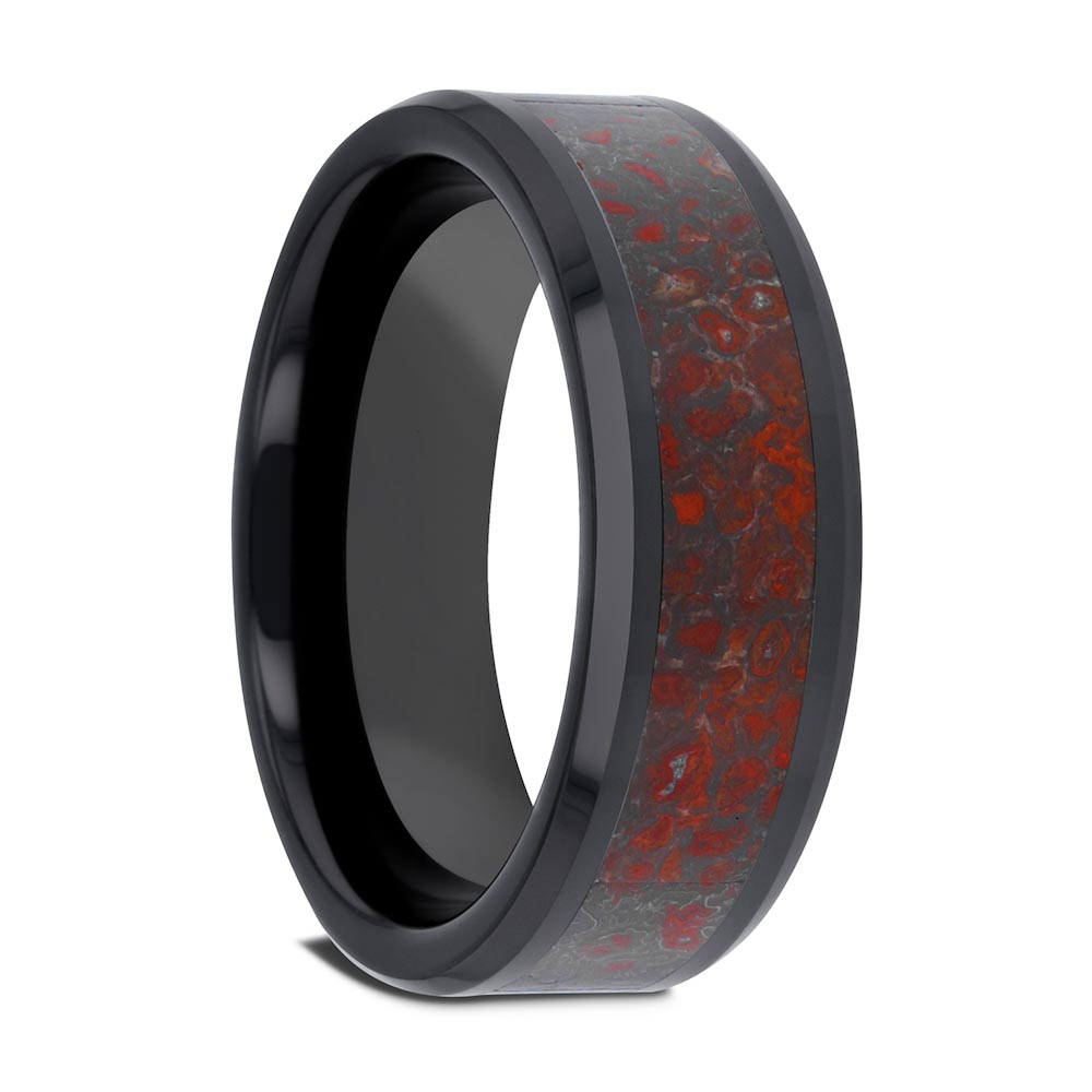 The complex design of this wedding band will leave you breathless. Remember the moment she set your heart on fire. It was probably also the first day that you laid eyes on her. If you remember that moment then we are convinced you hold the memory of the moment her returned love for you melted your heart into molten metal, flowing through your veins like liquid strength she keeps you going. May this red dinosaur bone inlaid women's wedding ring remind you of those moments and rekindle that ignition to spark you into motion. Like the black ceramic of the band encasing it she stands beside you in everything you do. Your biggest fan and greatest Ally we look forward to your love being written among the stars.