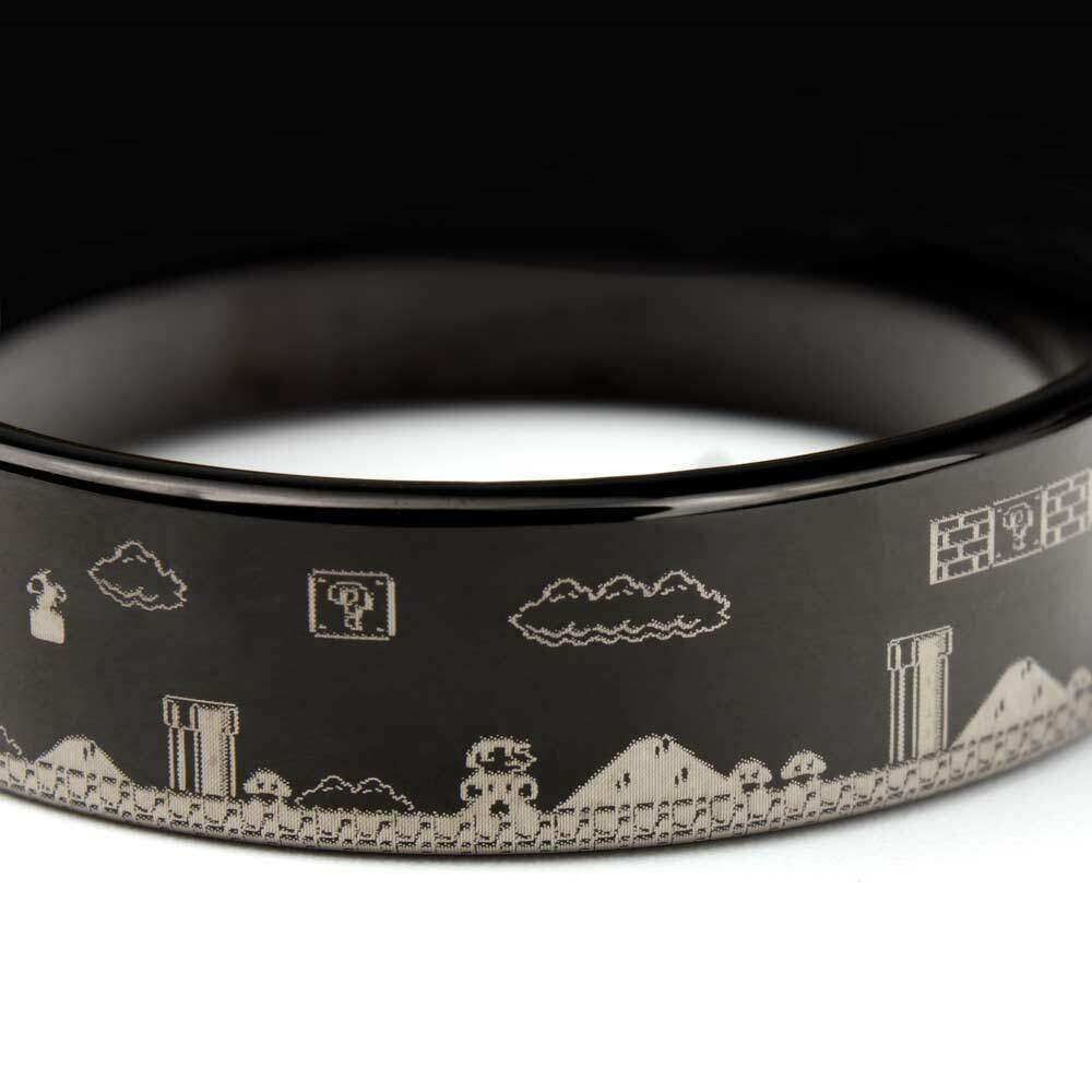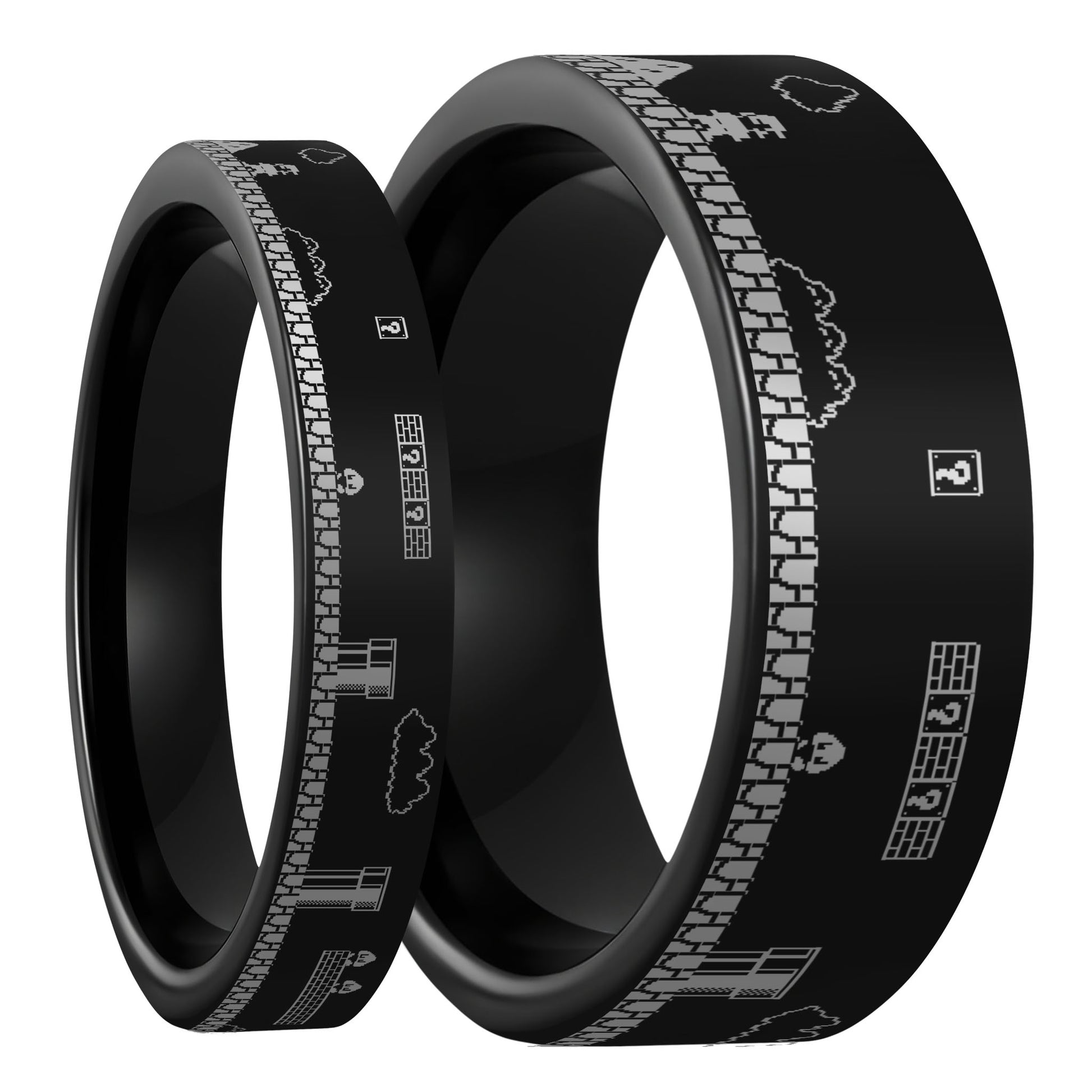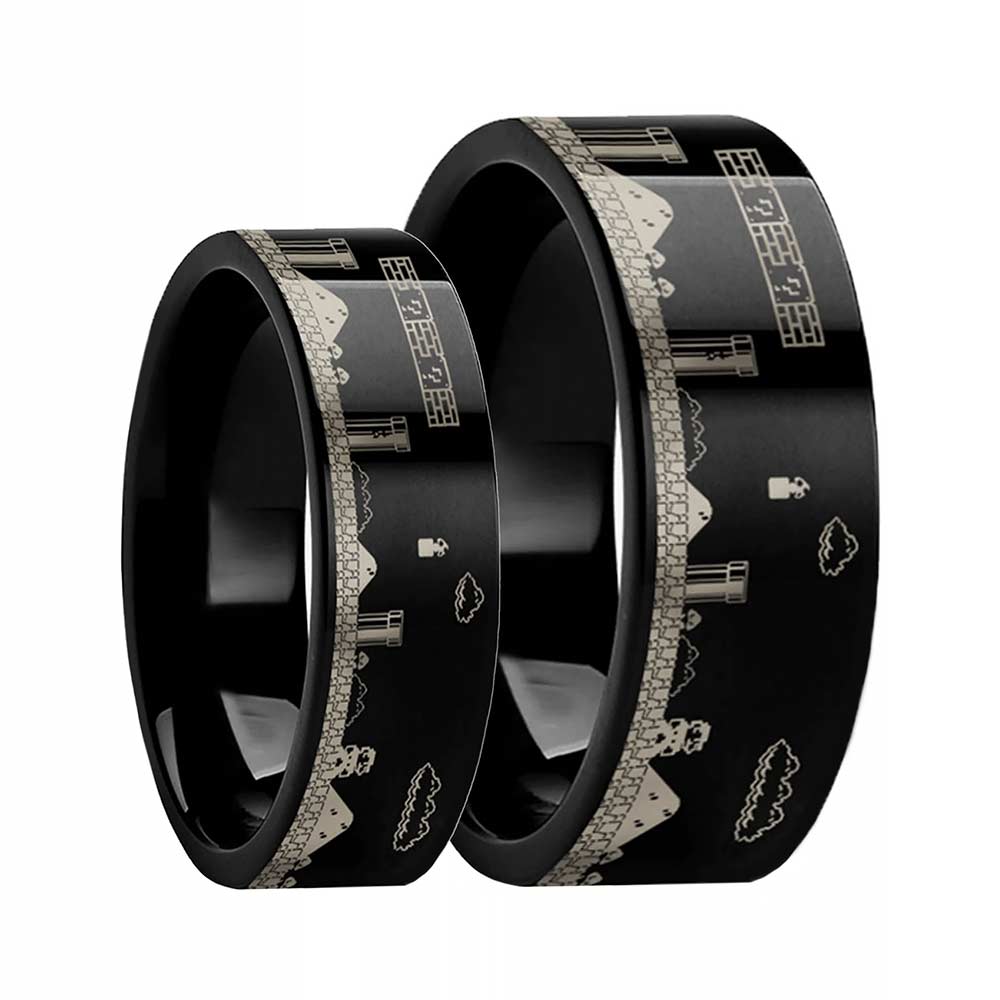 This set of Super Mario Bros Engraved Black Tungsten carbide Couple's Matching Wedding Band Set is perfect for the pair of old-school NES nerds. The classic Super Mario Bros scene will bring a smile and show your love year after year. Say goodbye to boring old rings and hello to a bold, unique design that perfectly symbolizes your love for each other. Made from high-quality tungsten carbide, these rings are built to last a lifetime – and we mean it! With our lifetime warranty, you can exchange them for damage or size changes. We've engraved the iconic Super Mario Bros characters onto the black finish, giving these rings that extra touch of personality that you've been searching for. Whether you're a gamer or simply a lover of all things quirky, these rings are sure to impress. Plus, with our affordable price point, you won't have to overspend to get the wedding bands of your dreams. Don't settle for boring, traditional rings when you can have a set that truly reflects your personalities. Our Super Mario Bros Engraved Black Tungsten Couple's Matching Wedding Band Set is the perfect way to show off your love in a way that's as unique as you are.
