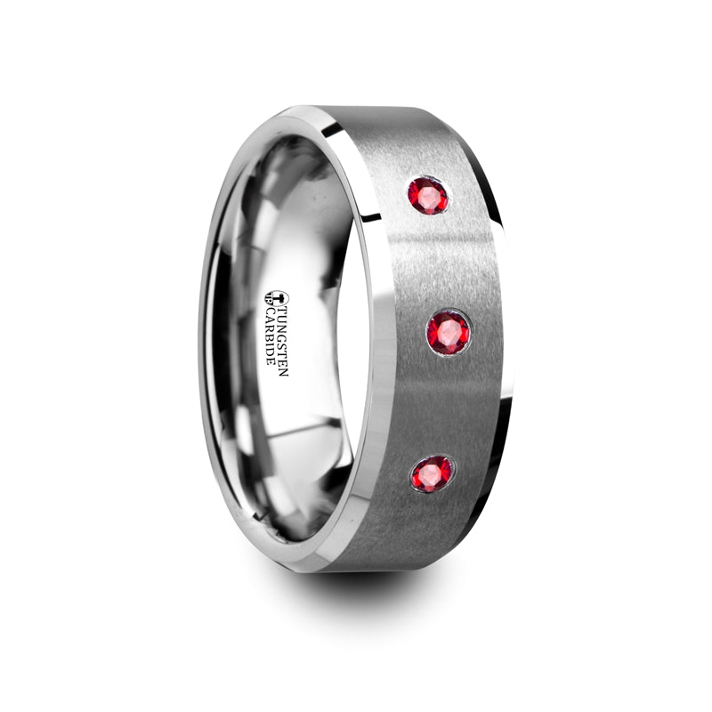 This handsome brushed tungsten carbide ring is sure to steal your heart with its stunning bright red rubies. These precious gems symbolize the passion, optimism, and joy that you will experience for the rest of your life. The bold red color of the rubies perfectly represents the love that you share with your partner, making this ring the perfect choice for your special day. The brushed texture of the band creates a unique contrast with the shining rubies, drawing attention to their beauty. The polished beveled edges ensure that this ring will fit comfortably and securely on your finger from the moment you slip it on. Whether you're looking for a meaningful symbol of your love or simply a stunning piece of jewelry, this ring is the perfect choice.