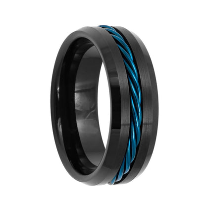 Alianza de boda de tungsteno negro con incrustación de cable trenzado azul