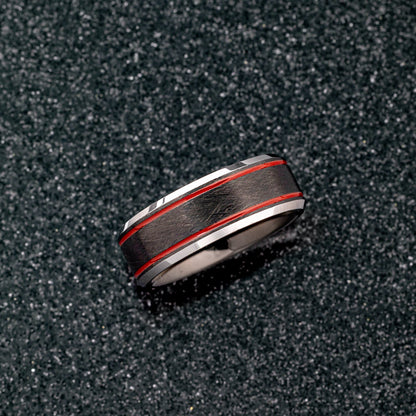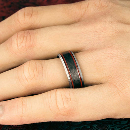 Alianza de boda para hombre de tungsteno cepillado con dos ranuras rojas