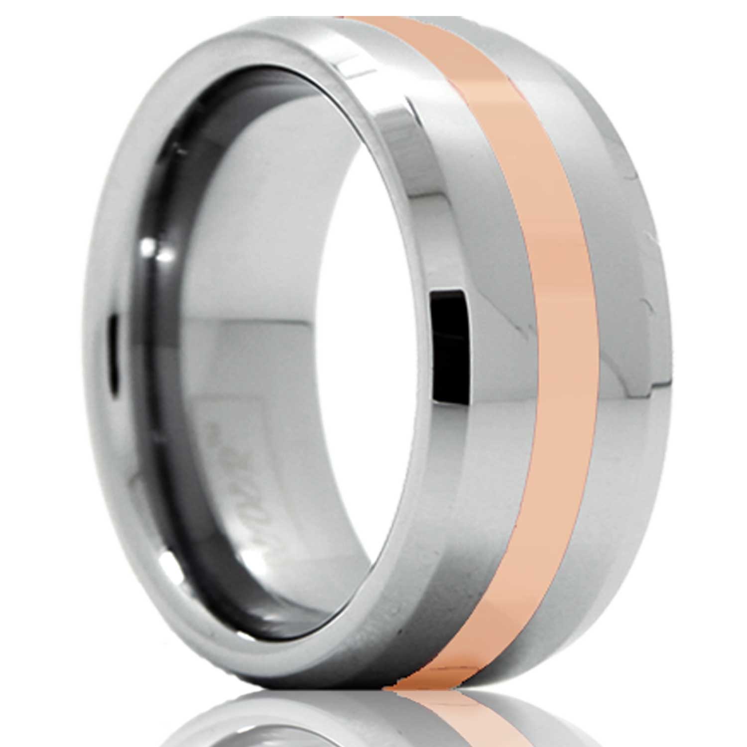 Alianza de boda de tungsteno con incrustaciones de oro rosado de 14 k y bordes biselados