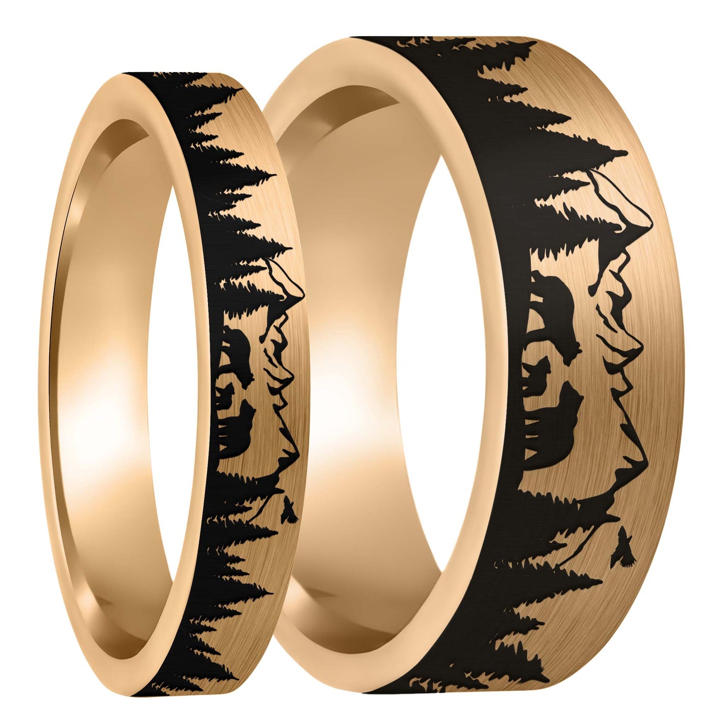 Mountain Range Forest Black Tungsten Couple's Matching Wedding Band Set