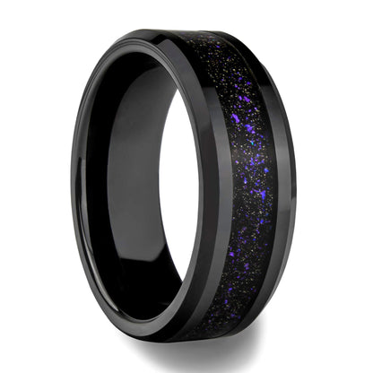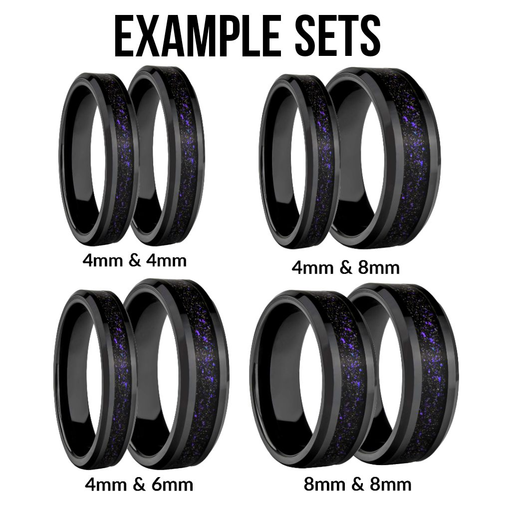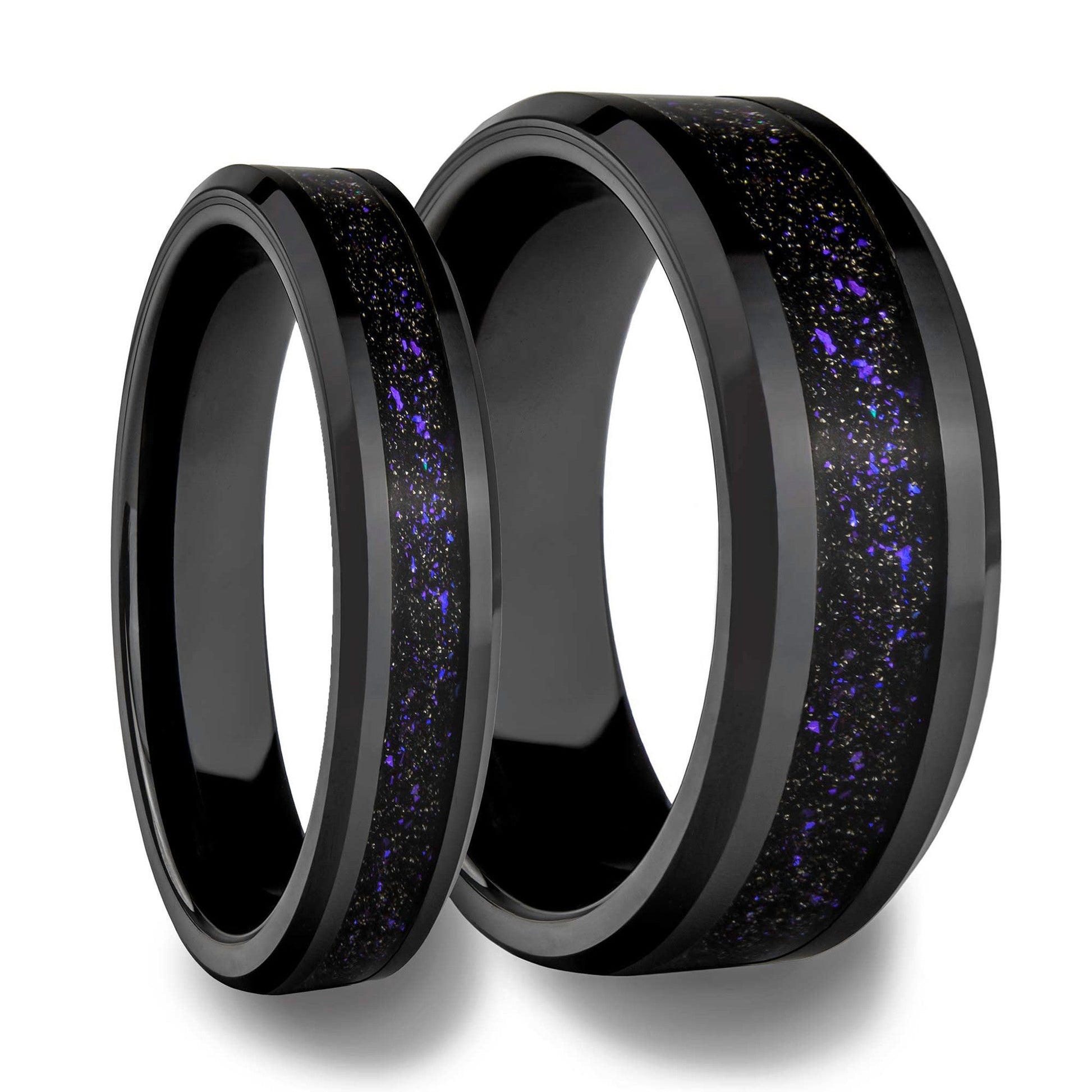 Juego de alianzas de boda a juego de cerámica negra para parejas con incrustaciones de piedra dorada galáctica púrpura