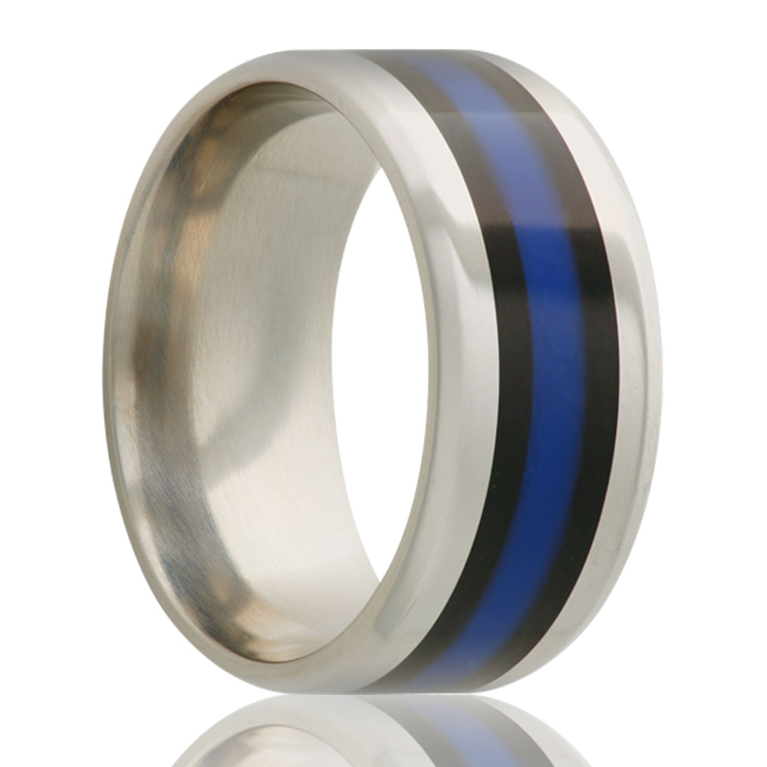 Alianza de boda de titanio con incrustaciones de rayas azules y bordes biselados