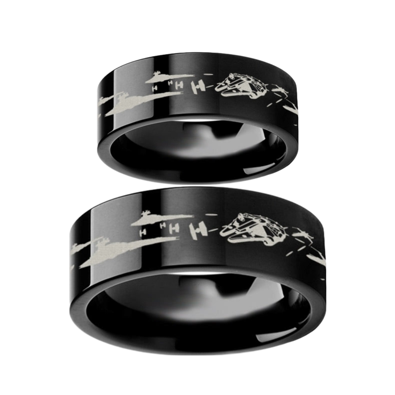 Alianza de boda de tungsteno negro con escena de batalla de Star Wars