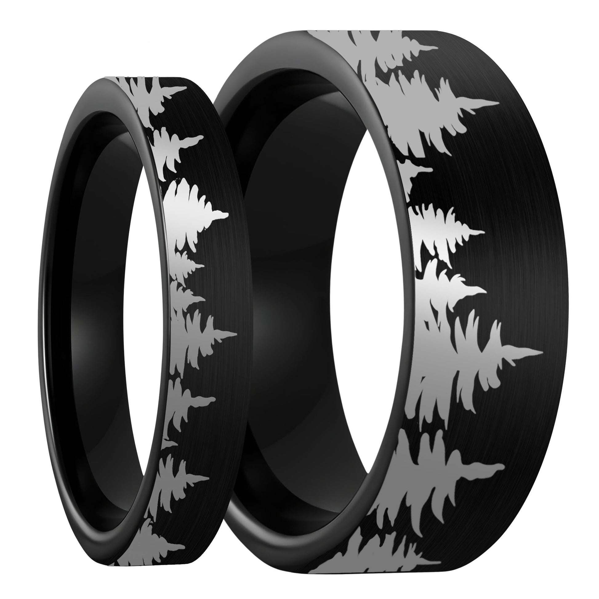 Mountain Range Forest Black Tungsten Couple's Matching Wedding Band Set