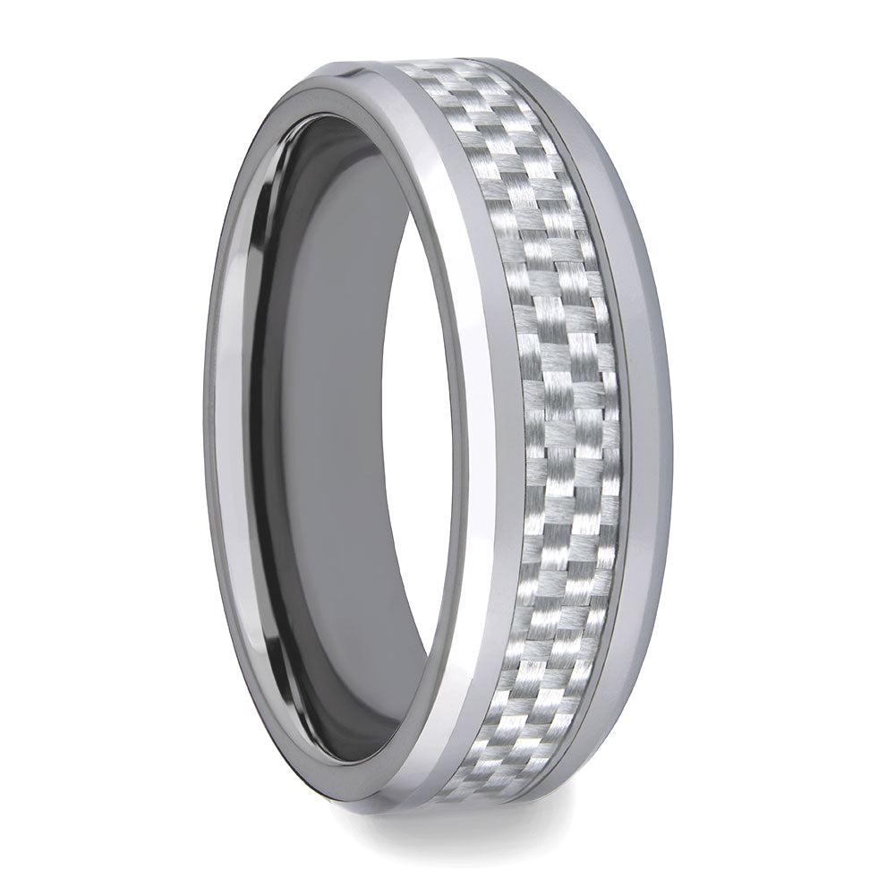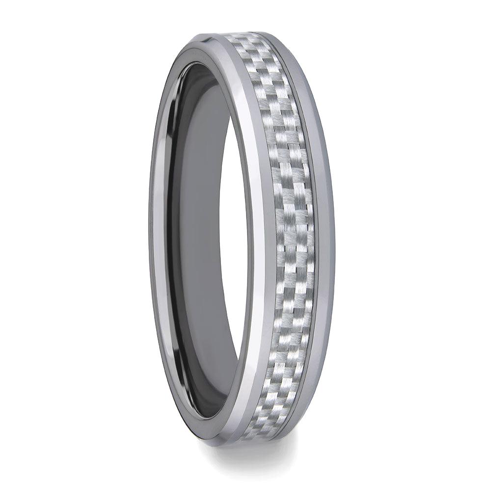 Alianza de boda de tungsteno para mujer con incrustaciones de fibra de carbono blanca