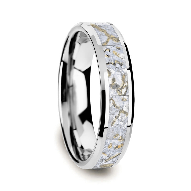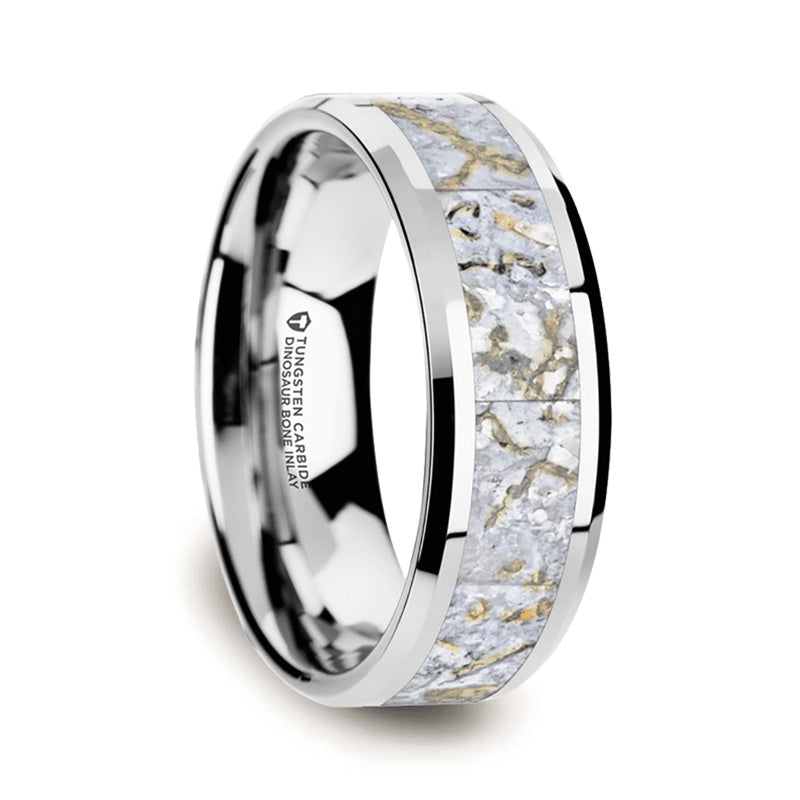 Alianza de boda de tungsteno para hombre con incrustaciones de hueso de dinosaurio blanco