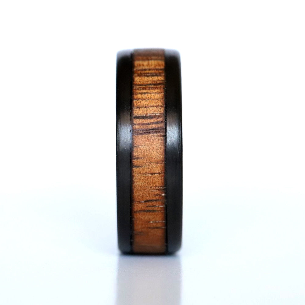 Canalisez votre côté hawaïen avec cette bague en bois de Koa, dotée de magnifiques bords en fibre de carbone foncé et d'un intérieur contrasté en titane. Cette alliance légère et hypoallergénique est fabriquée lors de votre commande, donc personne au monde n'en aura une comme la vôtre.
