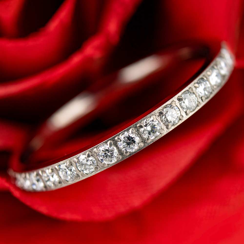 Pour un amour sans fin, cette alliance en titane pour femme présente une rangée infinie de diamants scintillants parfaitement assortis. Les diamants sont aussi uniques que votre histoire d'amour et vous rappelleront toujours celui qui occupe une place spéciale dans votre cœur. Une petite bague qui peut être empilée avec d'autres styles de bagues ou idéale comme alliance autonome pour célébrer votre engagement et votre amour éternels avec cette bague d'éternité. Le cercle de diamants sur la bague n'a ni début ni fin, tout comme l'amour que vous partagez avec votre moitié. Superbe et accrocheuse, la bague est dotée d'un style confortable. La rangée de diamants taille brillant crée un éclat exquis. Classique et indéniablement unique, cette bague présente un design intemporel qui constitue un symbole éternel de votre union. Cette bague comporte des pierres serties pour permettre à un maximum de lumière d'atteindre les diamants, ce qui met en valeur une sophistication de grande classe.