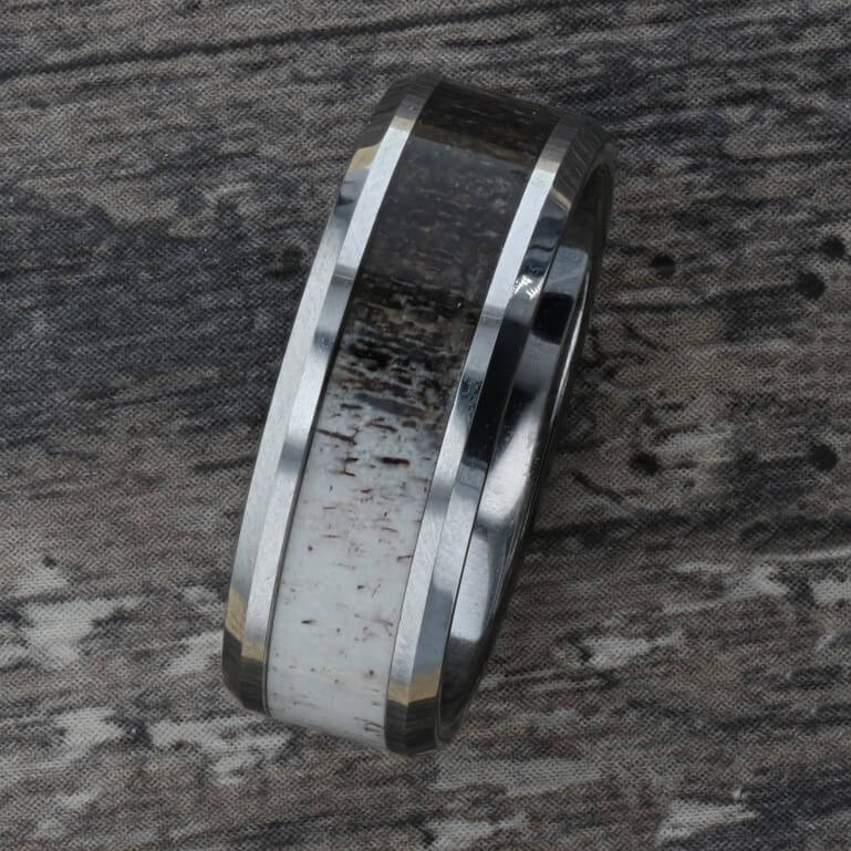 Alliance pour homme en céramique noire avec incrustation de bois de cerf marron foncé