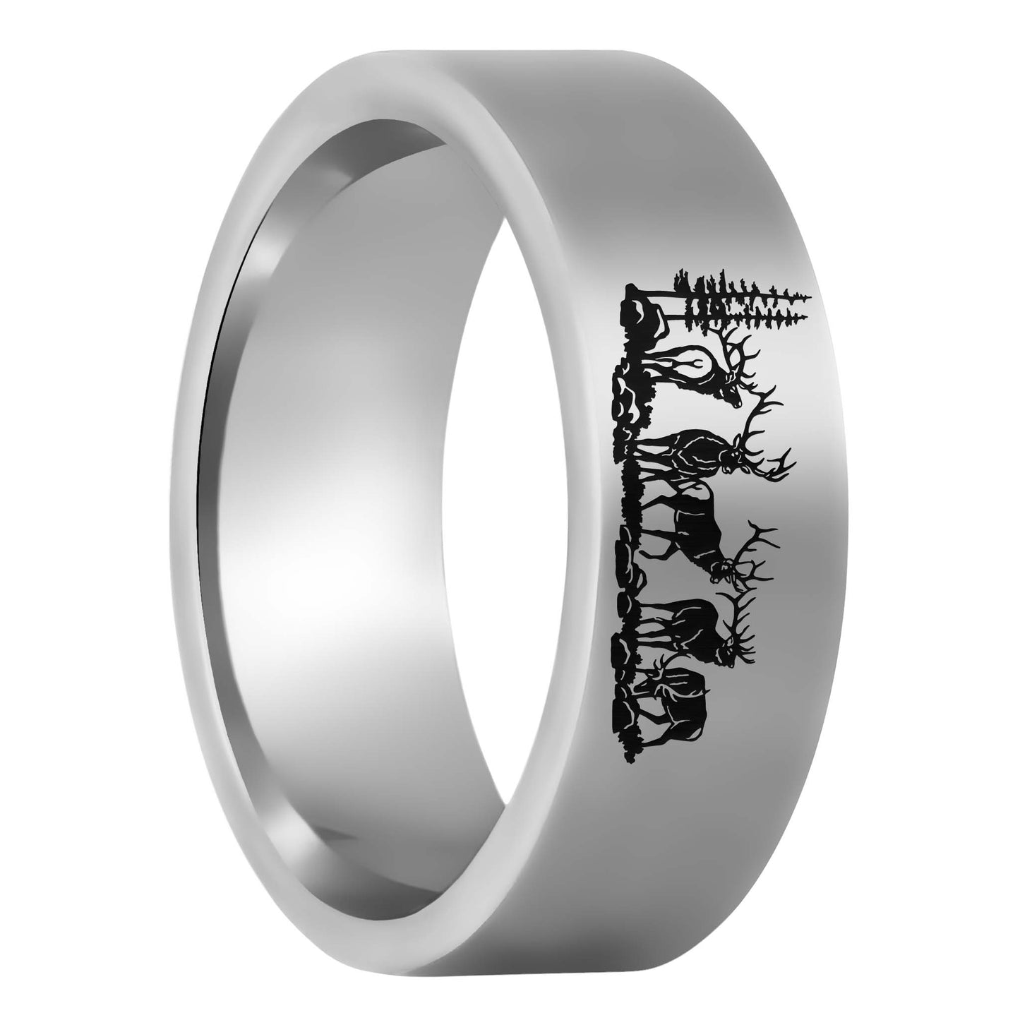 Vous appelant, l'impressionnant troupeau d'élans mâles puissamment gravés sur votre alliance semble vous dire que la famille est importante. Faites confiance à votre amour et à votre dévouement avec cette alliance. Les bords arrondis et la large bande offrent le confort que vous recherchez dans une bague que vous porterez tous les jours de votre vie. De couleur argent poli, la bague en carbure de tungstène sera durable et pourra résister à vos pratiques quotidiennes. Que vous marchiez avec confiance dans les rues d'une ville ou parmi les arbres sur un sentier, vous vous souviendrez du grand pouvoir de l'amour que vous et votre partenaire avez ensemble.