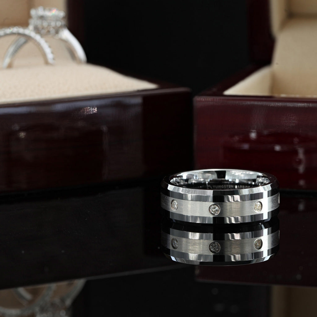 Alliance en tungstène pour homme avec incrustations en argent et huit diamants