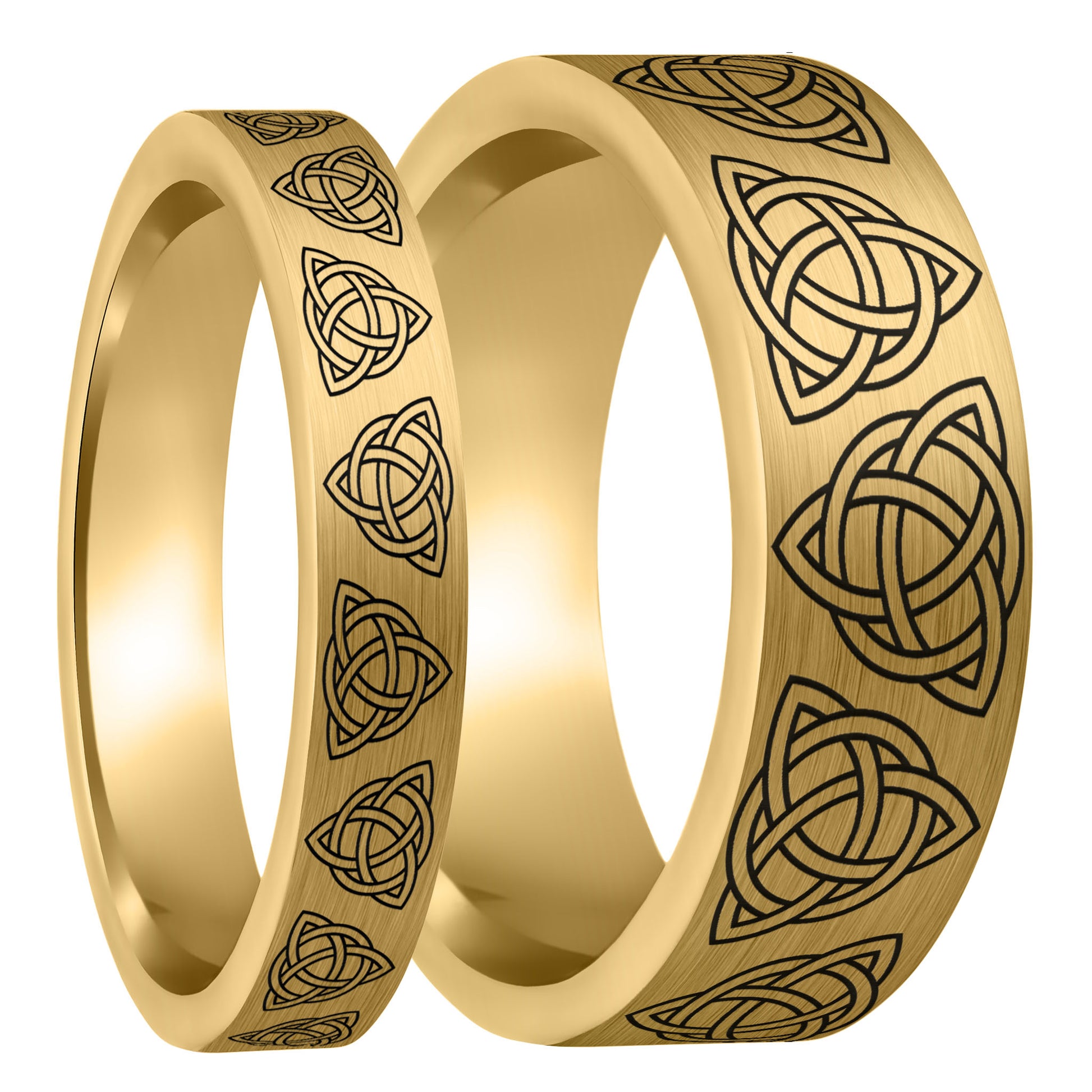 Ensemble d'alliances assorties pour couple en tungstène doré brossé avec nœud de la trinité celtique