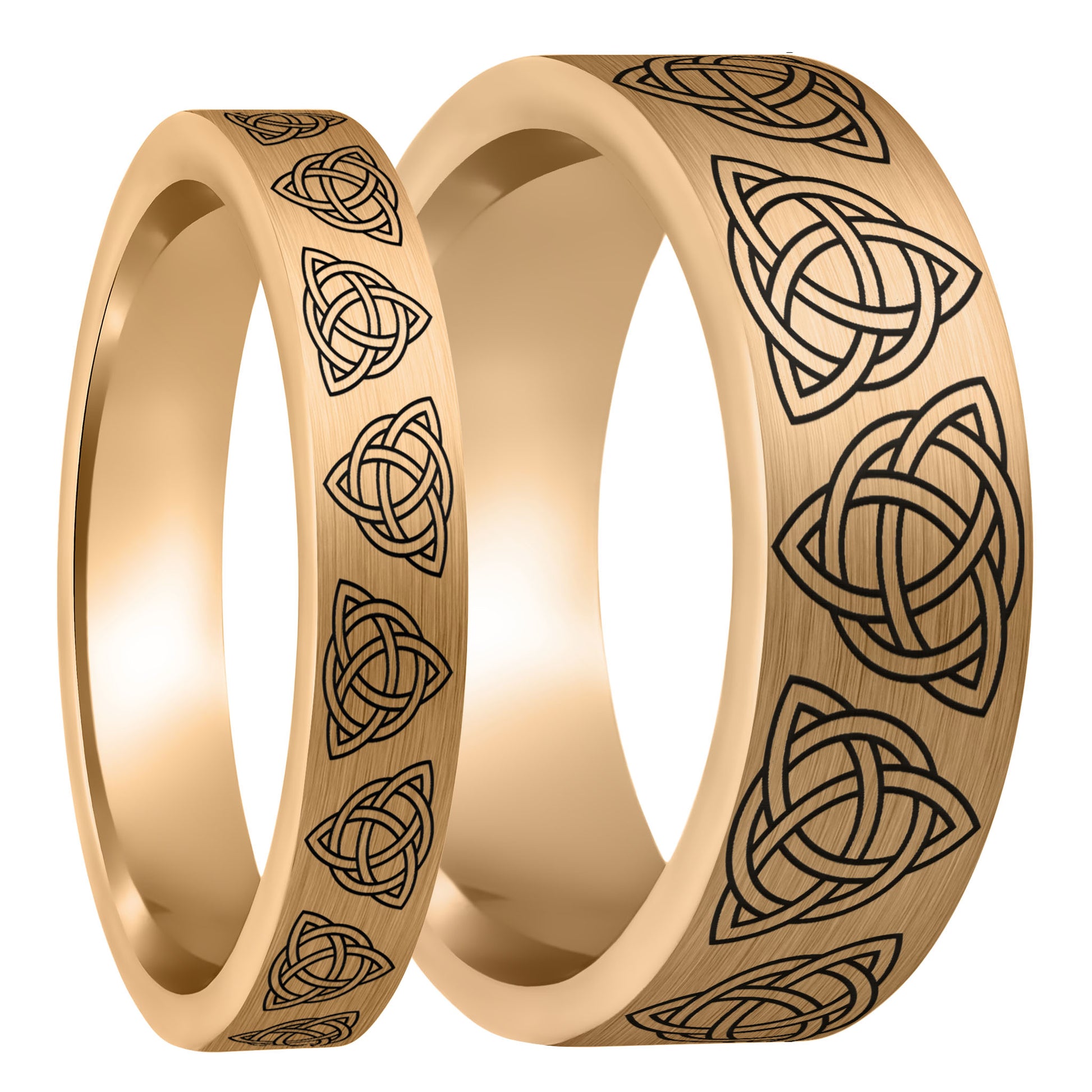 Ensemble d'alliances assorties pour couple en tungstène or rose brossé avec noeud de la trinité celtique