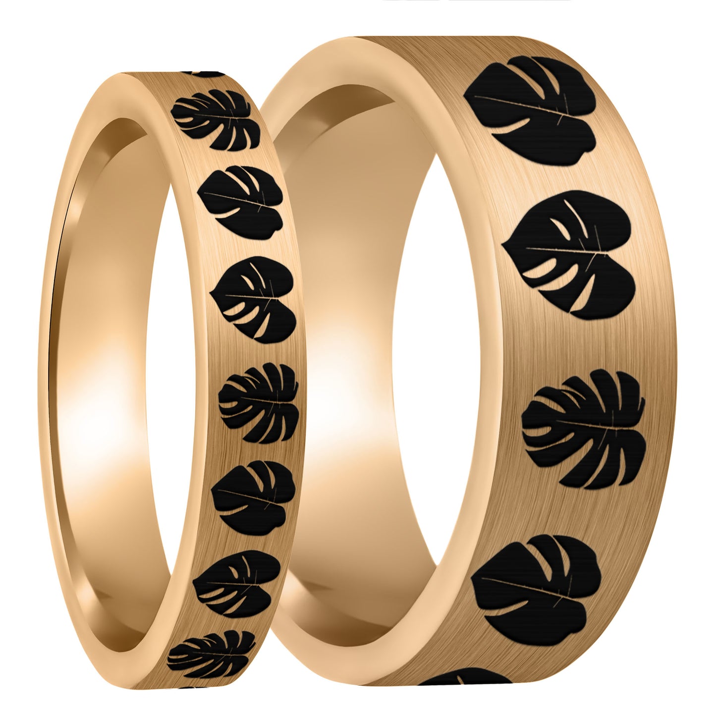 Ensemble d'alliances assorties pour couple Monsterra Leaves en tungstène or rose brossé