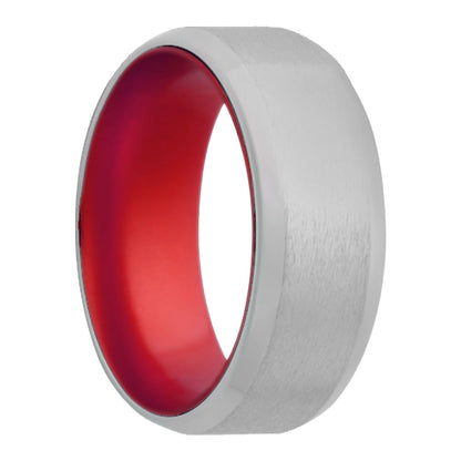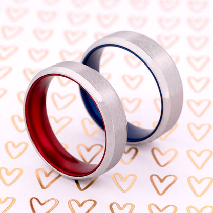 Alliance en satin de cobalt avec bords biseautés et centre rouge
