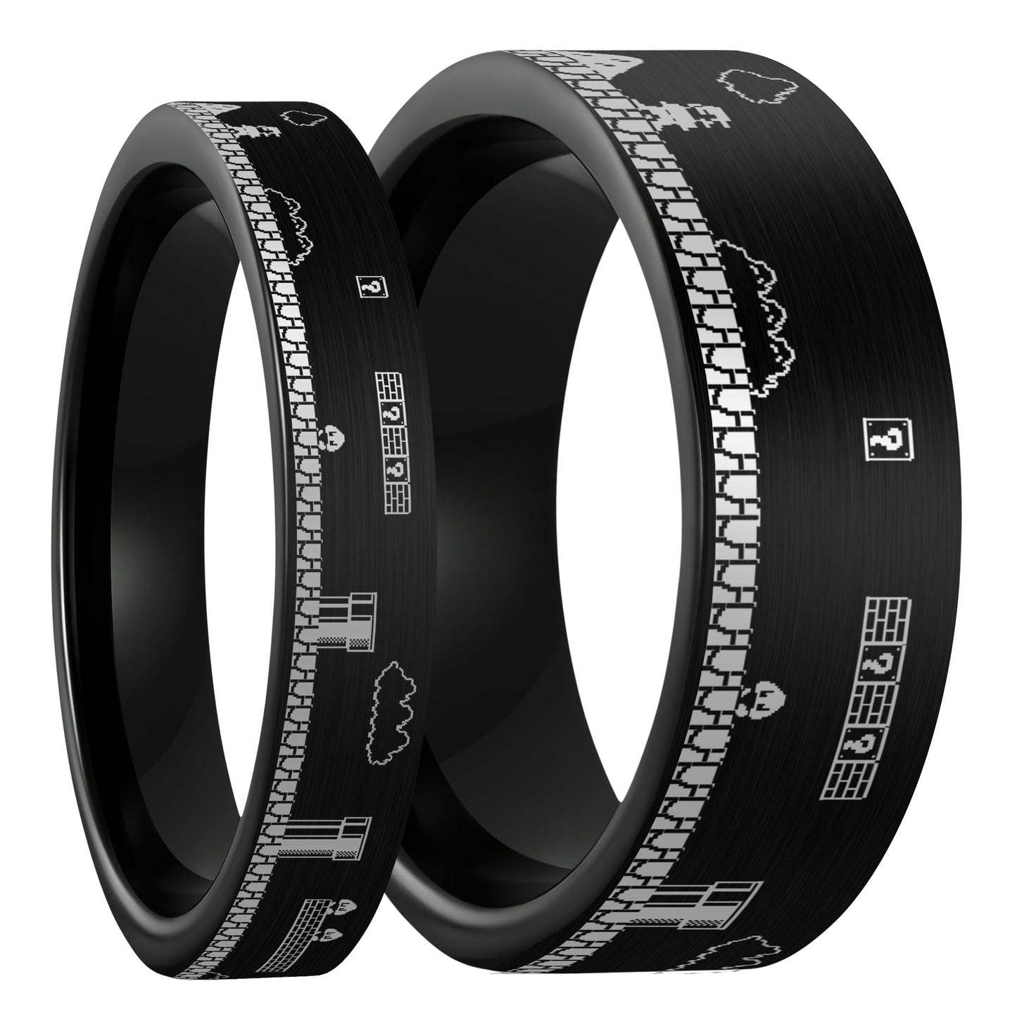 Ensemble d'alliances assorties pour couple en carbure de tungstène noir gravé Super Mario Bros