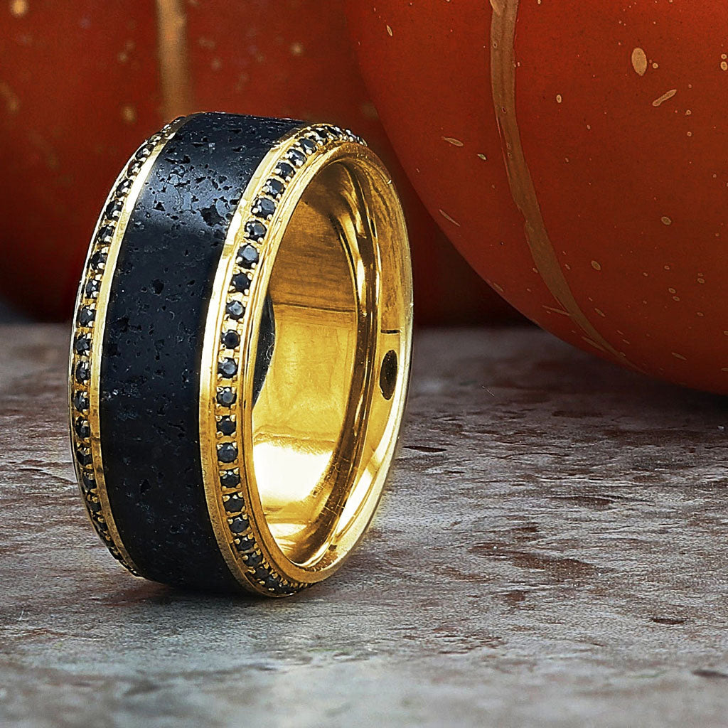 10k Yellow Gold Men's Wedding Band with Lava Rock Inlay & Black Diamonds