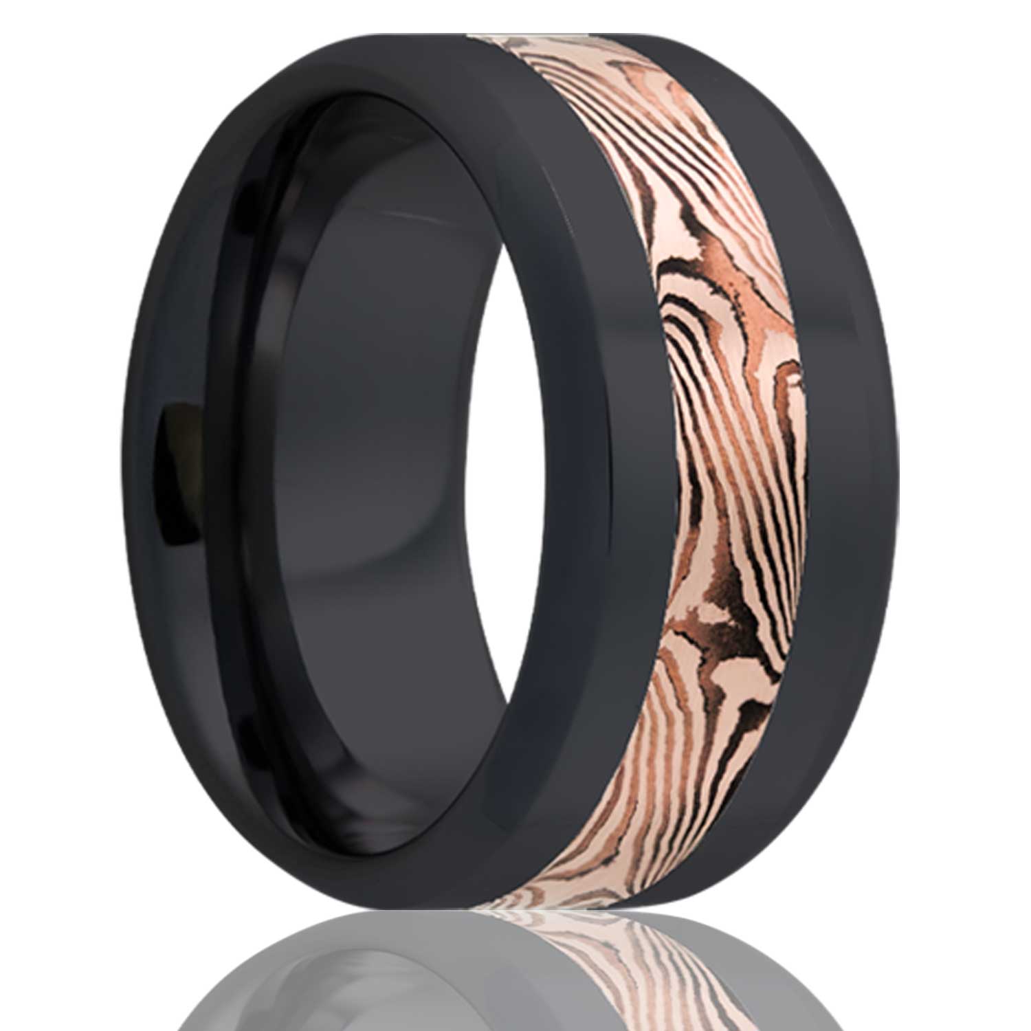 14k Rose Gold & Shakudo Mokume Gane Inlay Zirconium Wedding Band with Beveled Edges
