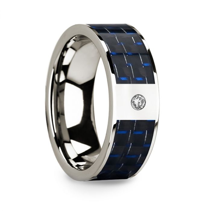 14k White Gold Men's Wedding Band with Blue & Black Carbon Fiber Inlay and Diamond
