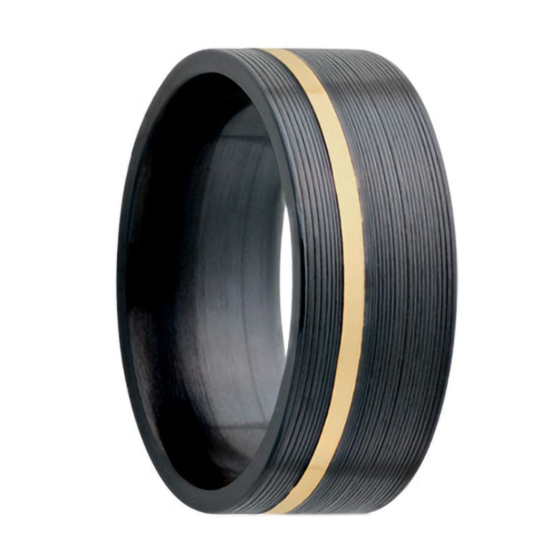 Asymmetrical 14k Yellow Gold Inlay Ridged Zirconium Wedding Band