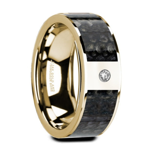 14k Yellow Gold Men's Wedding Band with Blue Dinosaur Bone Inlay & Diamond